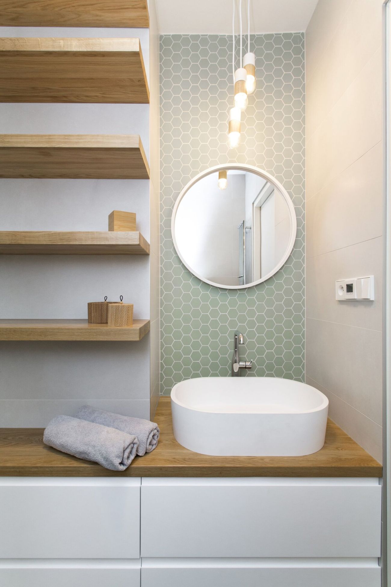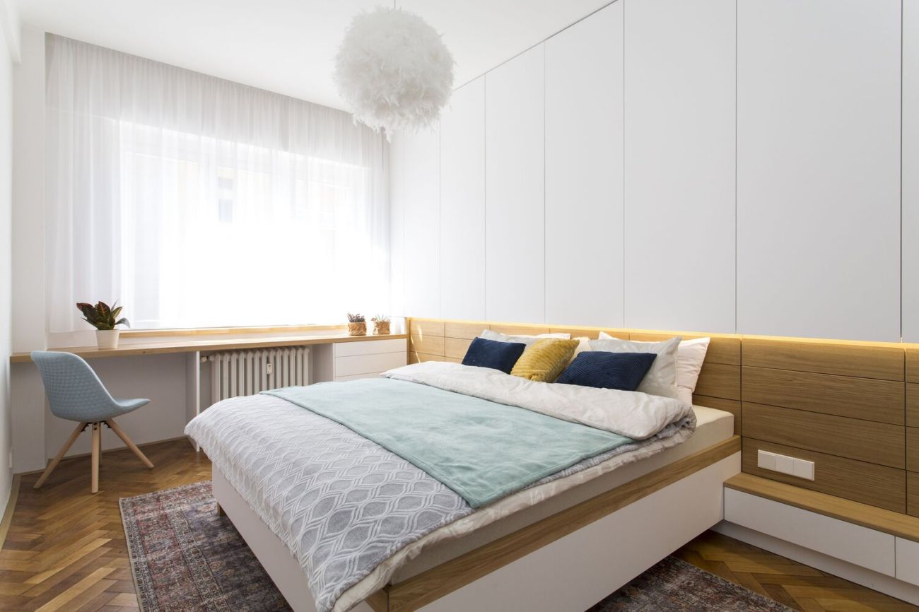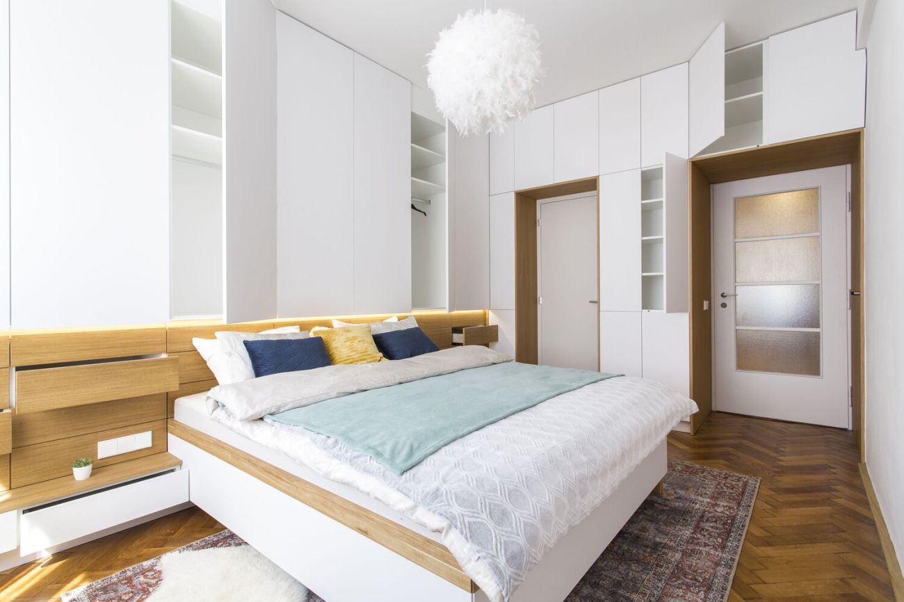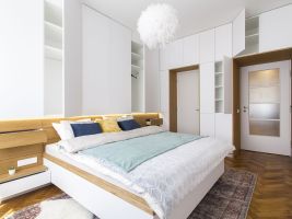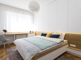 Truhlářské prvky v přírodním dubu jsou doplněné bílou výmalbou a dalšími jemnými pastelovými barvami, které se prolínají napříč interiérem, najdeme je například na dlažbě v koupelně. Ložnice nabízí velké množství úložných prostor.