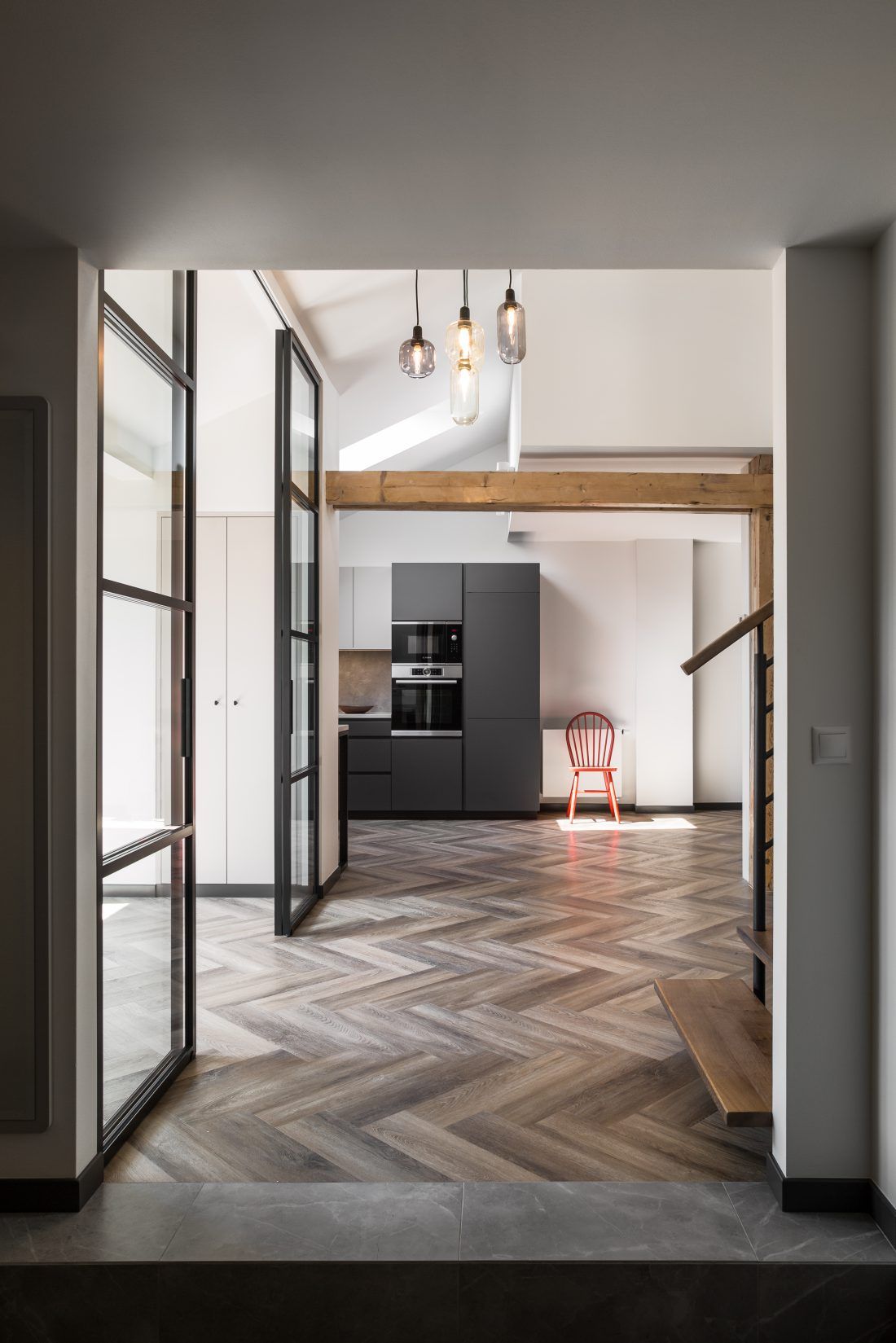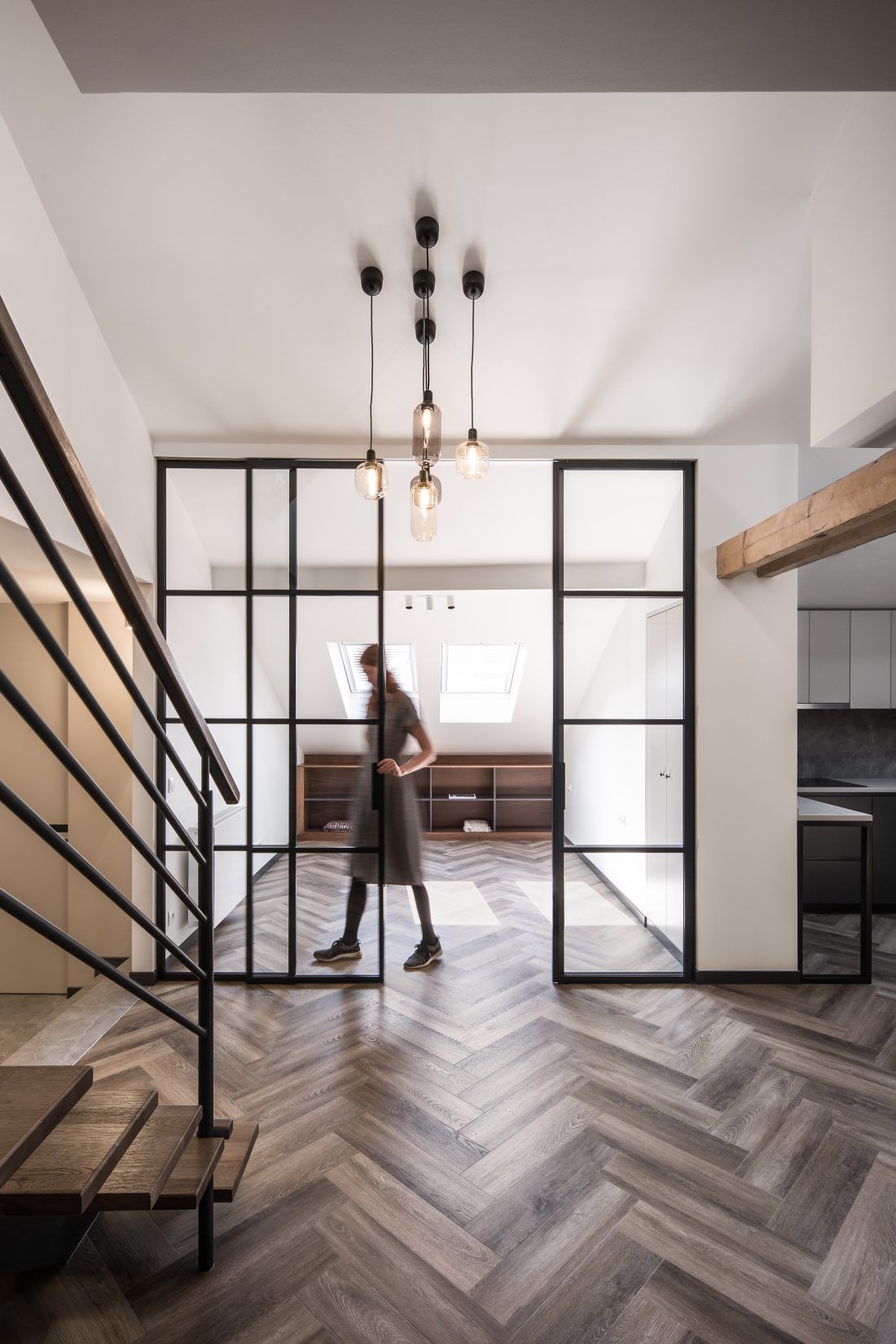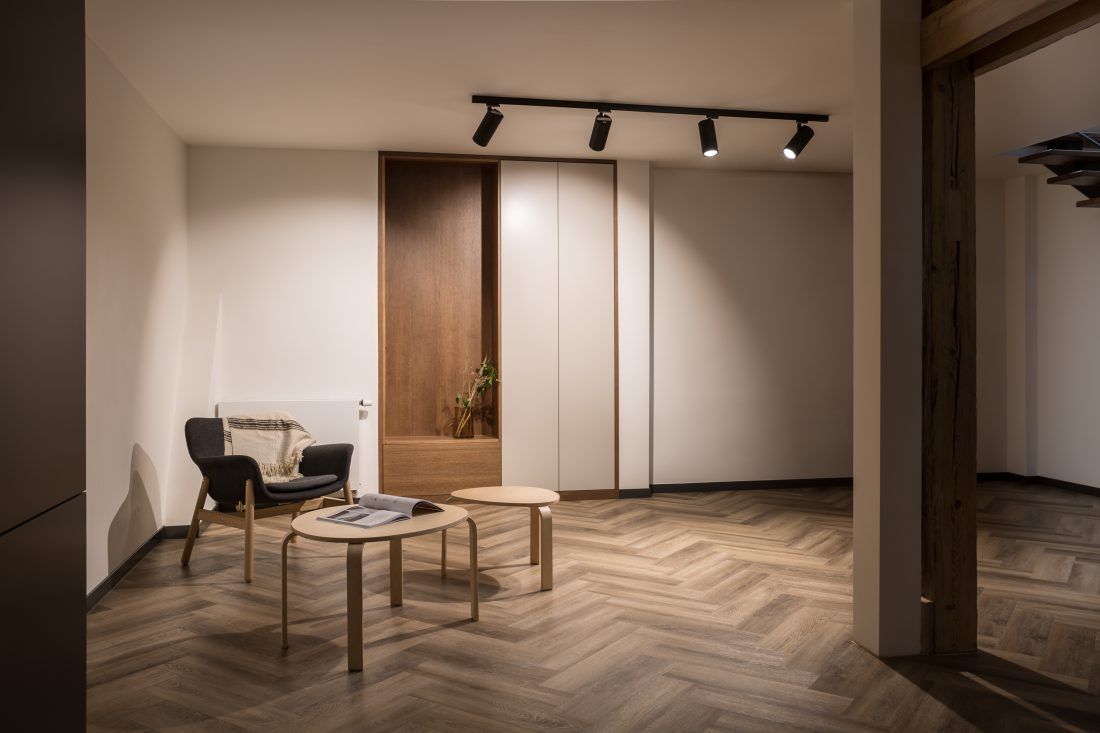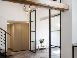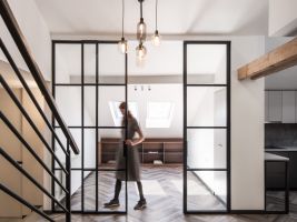 Díky zbrusu nové obnově získalo přízemí mezonetu nové světlo. Architekti ze Studia Acht totiž do spodního pokoje umístili celoskleněné stěny s posuvnými dveřmi, které vytváří dokonalý předěl mezi kuchyní, pokojem a vstupní halou. Také kuchyň získala nové světlo, a to díky střešnímu oknu. Po zbourání sádrokartonových příček se projektantům naskytl vzdušný prostor, který proměnil celkový charakter mezonetu. Vznikl tak prostorný obývací pokoj. K celkovému rázu interiéru se dokonale hodí přiznané dřevěné trámy a odhalená část krovu. Celkově prostředí dávají příjemnou atmosféru vhodně zvolené pastelové barvy v kombinaci s černou.