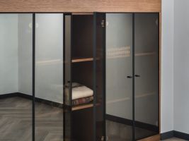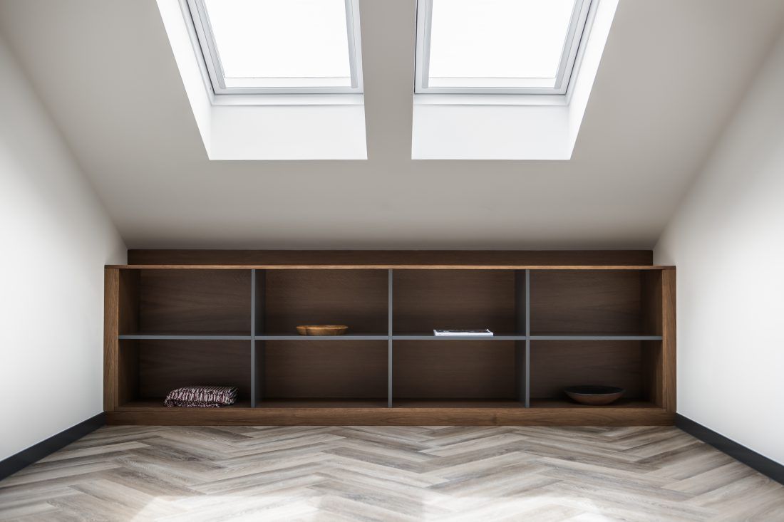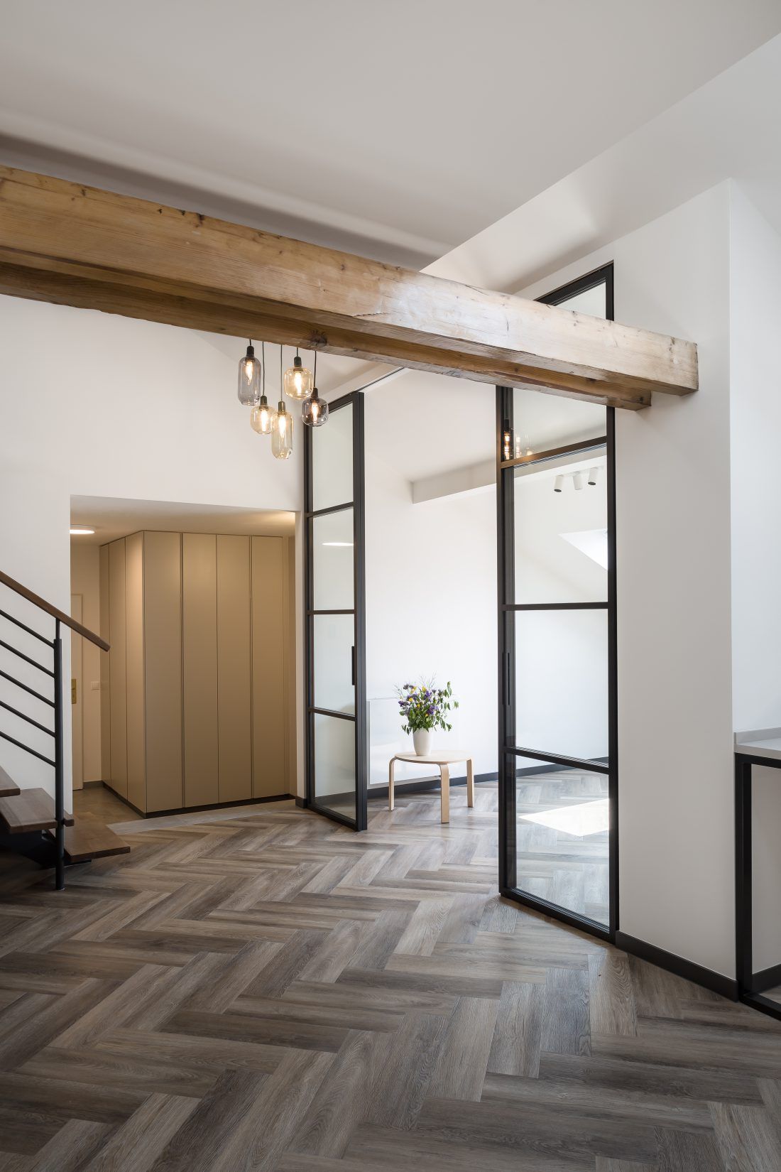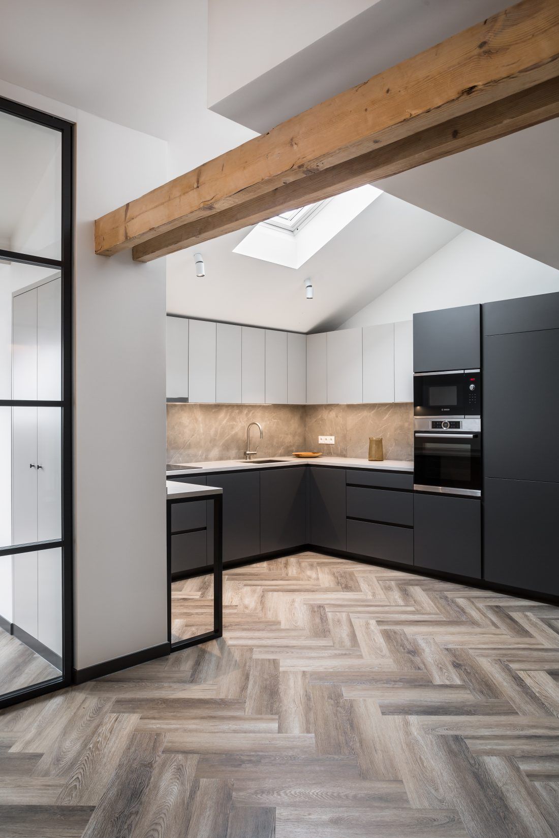 Díky zbrusu nové obnově získalo přízemí mezonetu nové světlo. Architekti ze Studia Acht totiž do spodního pokoje umístili celoskleněné stěny s posuvnými dveřmi, které vytváří dokonalý předěl mezi kuchyní, pokojem a vstupní halou. Také kuchyň získala nové světlo, a to díky střešnímu oknu. Po zbourání sádrokartonových příček se projektantům naskytl vzdušný prostor, který proměnil celkový charakter mezonetu. Vznikl tak prostorný obývací pokoj. K celkovému rázu interiéru se dokonale hodí přiznané dřevěné trámy a odhalená část krovu. Celkově prostředí dávají příjemnou atmosféru vhodně zvolené pastelové barvy v kombinaci s černou.
