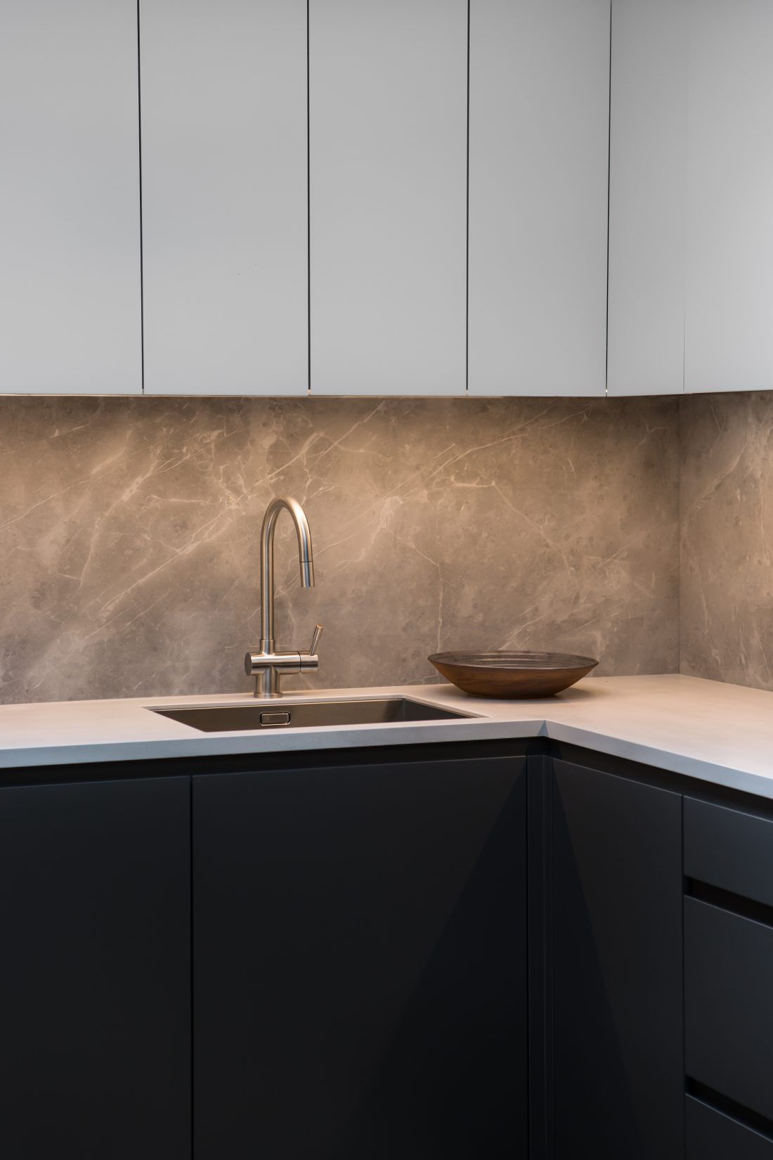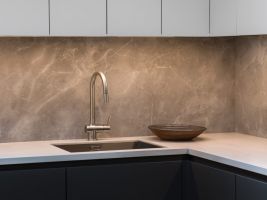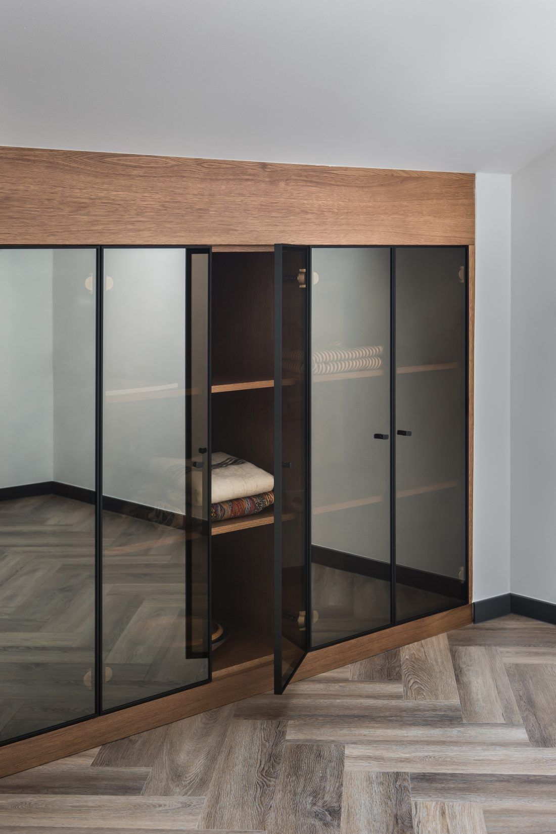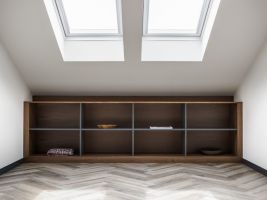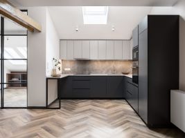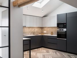 V přízemí i v horním patře byly zmodernizovány původní koupelny, kde byla použita velkoformátová keramika v barvách šedé a černé. V celém bytě byl na přání klienta navržen a vyroben nábytek v moderním jednoduchém stylu v jemných barevných odstínech v kombinaci s dubovou dýhou, který účelně a prakticky zaplňuje interiér.