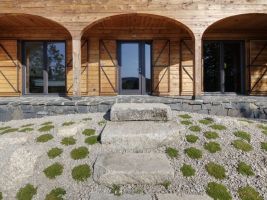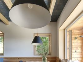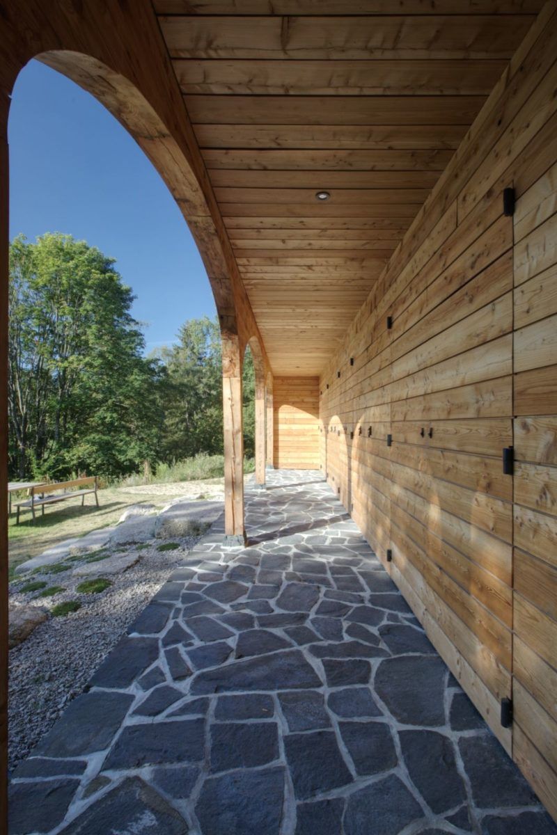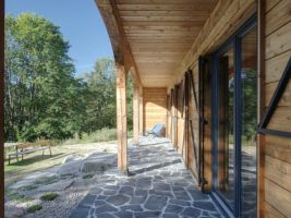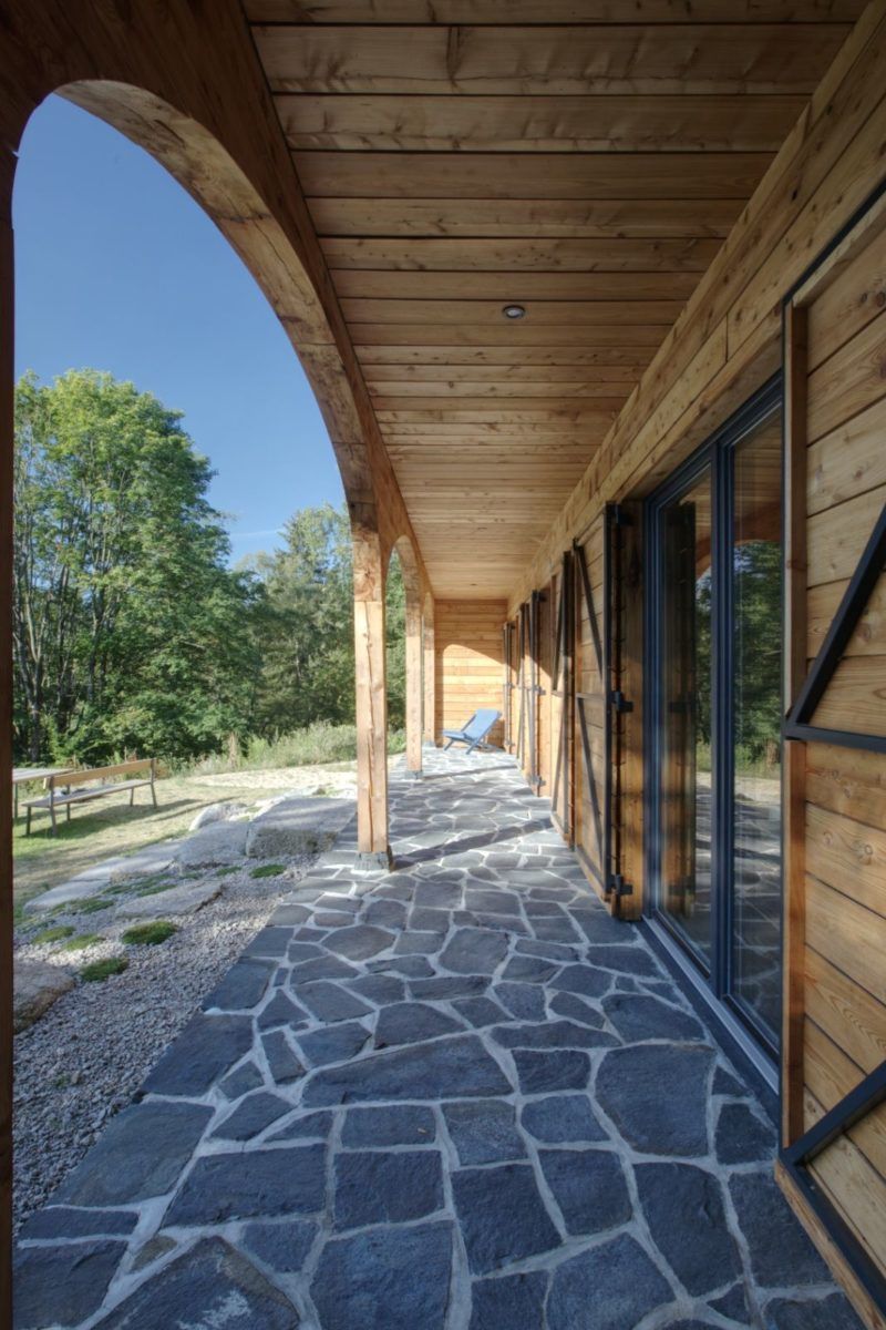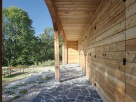 Architekti pracovali s přírodními materiály, jako je kámen a modřínové dřevo v opalované podobě. Střecha je plechová. Velmi chytře byl využit prostor pod střechou, kde vznikla veranda. Místo odkazuje na dřívější princip podstávky.