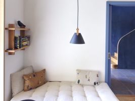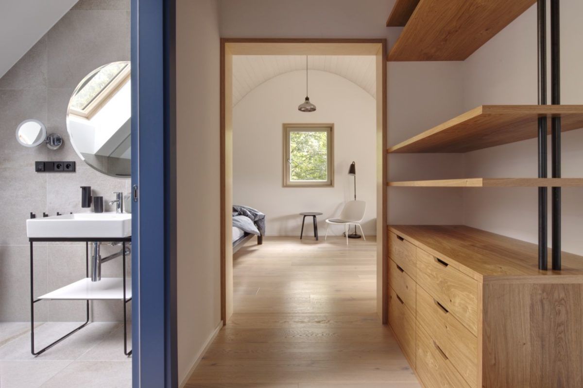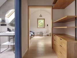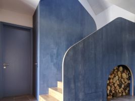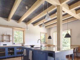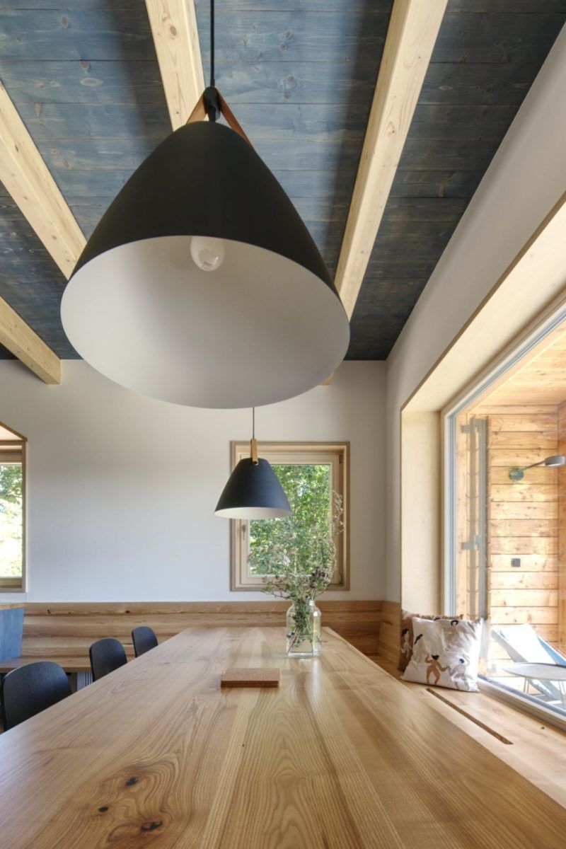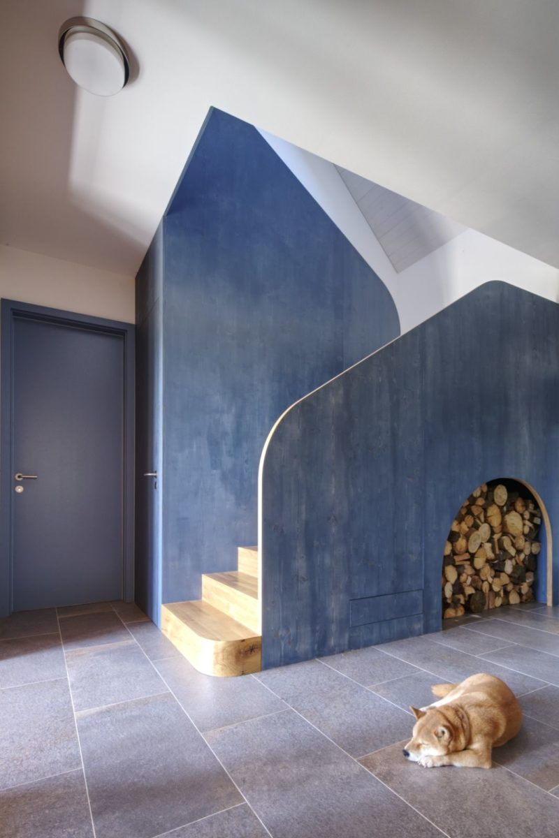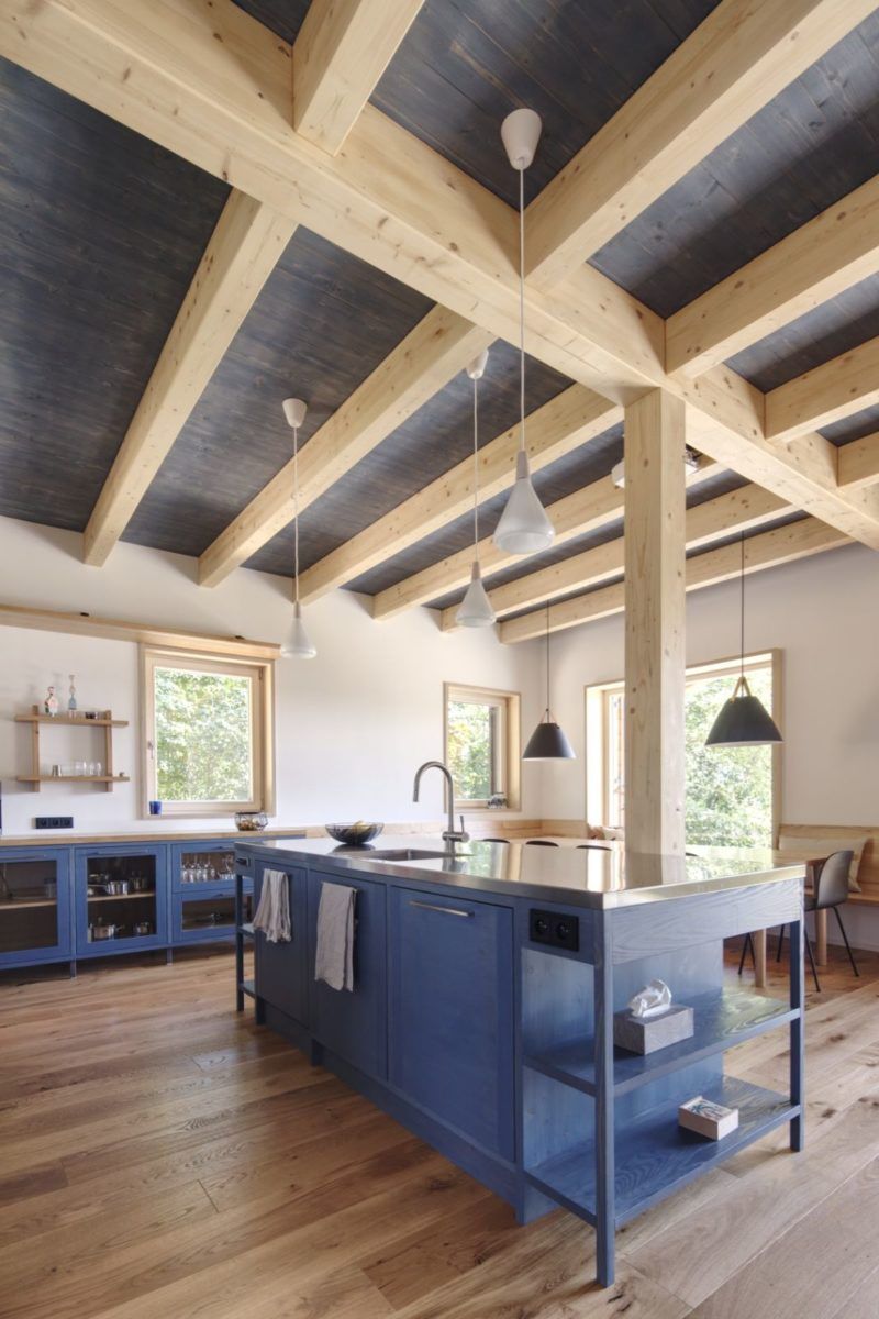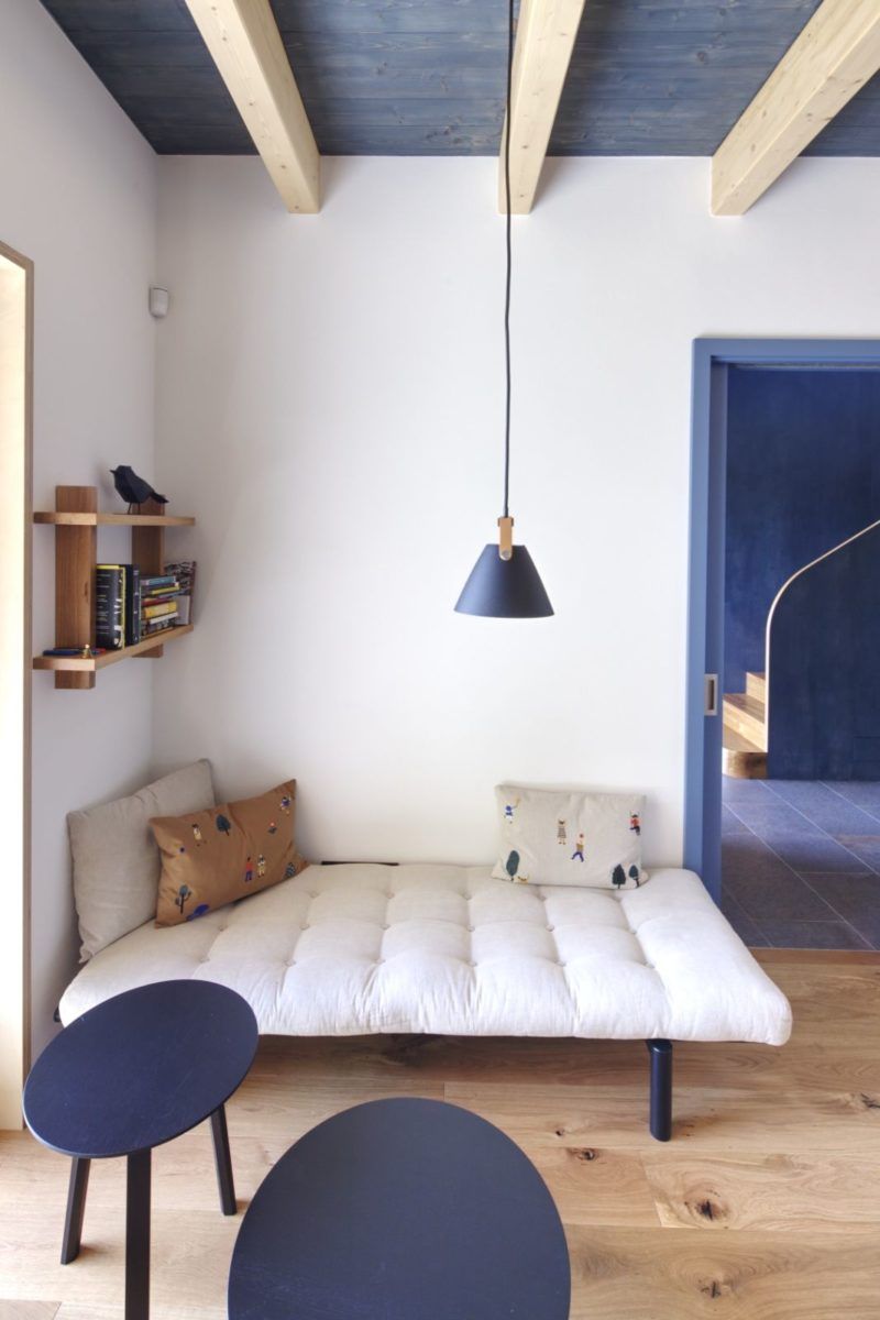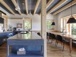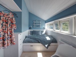 V dolní části domu najdeme centrální obytnou část, v patře pak tři pokoje s vlastním hygienickým zázemím. Interiér je zařízen tradičně v duchu nadčasového designu. Velmi útulně a svěže působí modrá barva v kombinaci s přírodním dřevem.