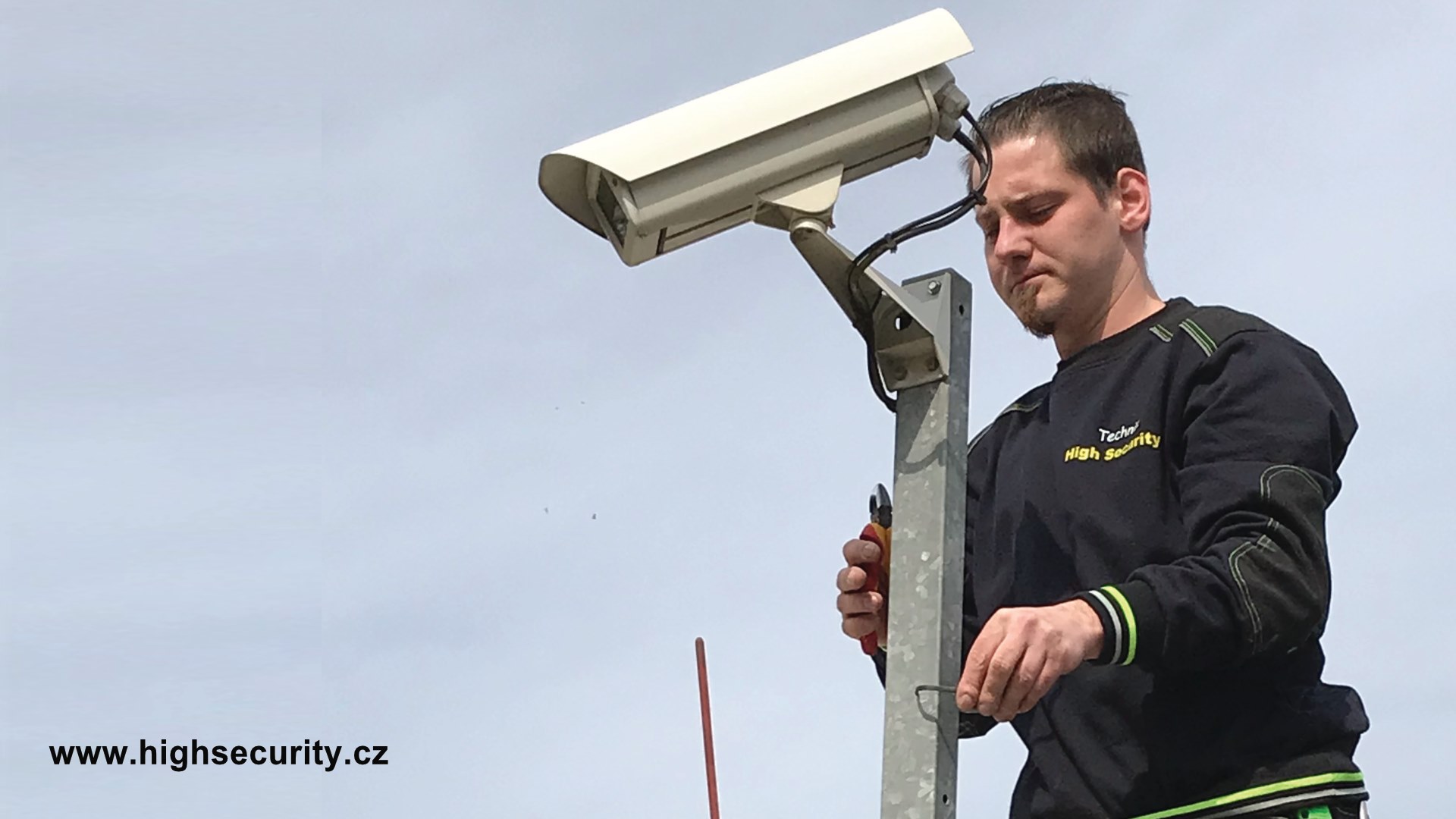 Technik dokončuje instalaci průmyslové kamery střežící vjezd do areálu. V tomto případě museli pro kameru navrhnout a vyrobit i sloupek, aby dosáhli potřebného záběru.