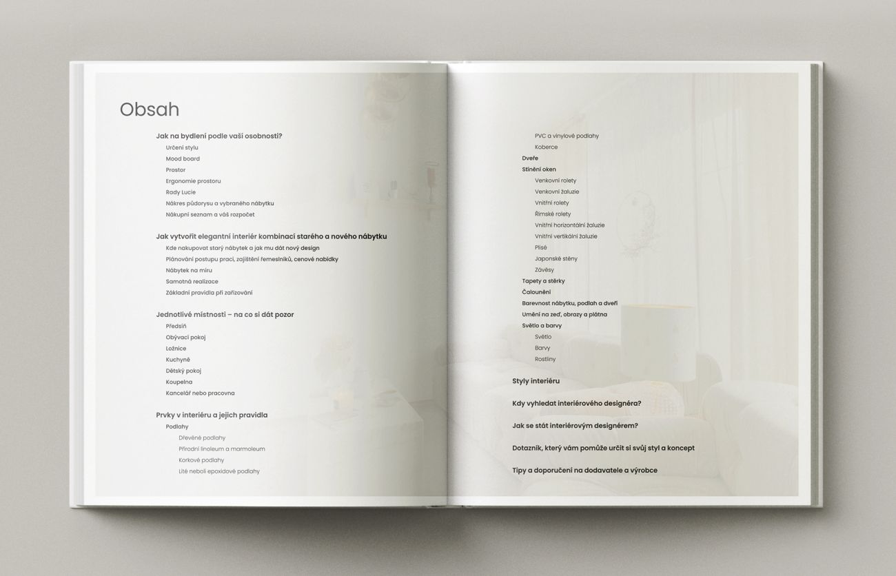 Napoví již názvy jednotlivých kapitol. Kniha začíná výběrem bydlení podle osobnosti, pokračuje návodem, jak vhodně zkombinovat staré s novým a dále podrobně rozebírá možnosti jednotlivých místností. V knize se dočtete také o pravidlech stínění, výběru dveří, tapet či o tom, jak naši psychiku dokáží ovlivnit barvy nebo osvětlení. Najdete zde také tipy a doporučení na ověřené výrobce a dodavatelé. Designérka se v publikaci zaměřila i na různé interiérové styly a sama poradí s tím, jak vybrat vhodného bytového designéra. Rady a tipy zde najdou i ti, kdo by se sami chtěli stát návrhářem.