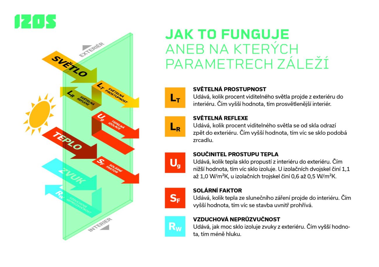 Jedním z nejdůležitějších parametrů zasklení je solární faktor (g) udávající, jak je zasklení schopné propouštět tepelnou energii ze slunečního záření, čím je jeho hodnota vyšší, tím lépe. Například v případě zasklení trojsklem IZOS ENERGY+ je to hodnota nad 0,6, tedy 60% propustnosti tepelné energie. V zimních měsících, kdy je slunce nízko nad horizontem, zajišťuje takové zasklení cenné solární zisky, jeho perfektní tepelněizolační vlastnosti díky využití tří skel v teplých distančních rámečcích zase zaručují, že získané teplo neuniká z interiéru zpět. Okna pak vytápějí místnost zcela zdarma. „Testování naší společností ukázalo, že zasklení dosahuje povrchové teploty na vnitřním skle až o 2 °C vyšší než běžné zasklení, v úspoře na vytápění to představuje kolem 15 % výdajů,“ vysvětluje Andrea Stejskalová. Tyto výhody mohou například u novostaveb zcela eliminovat jindy potřebné technologie pro získávání obnovitelných zdrojů. „Za určitých podmínek, například při vhodné orientaci budovy a velikosti oken, se můžeme při návrhu nové budovy obejít například bez doplňkových solárních systémů či tepelného čerpadla i při současných velmi přísných nárocích na energetickou spotřebu budovy. Úspora vstupních nákladů proto může být opravdu velká,“ doplňuje.