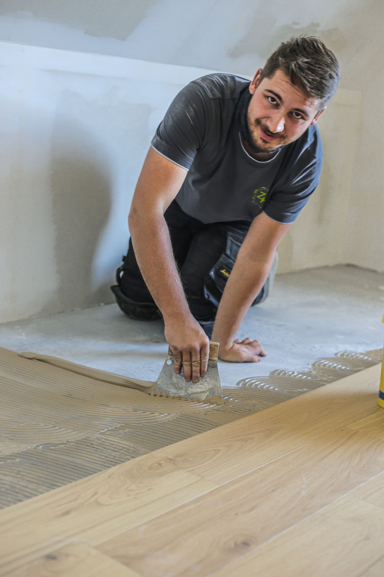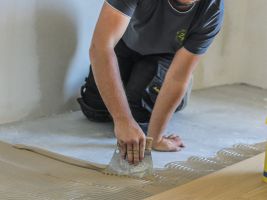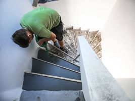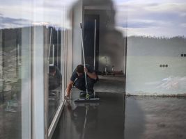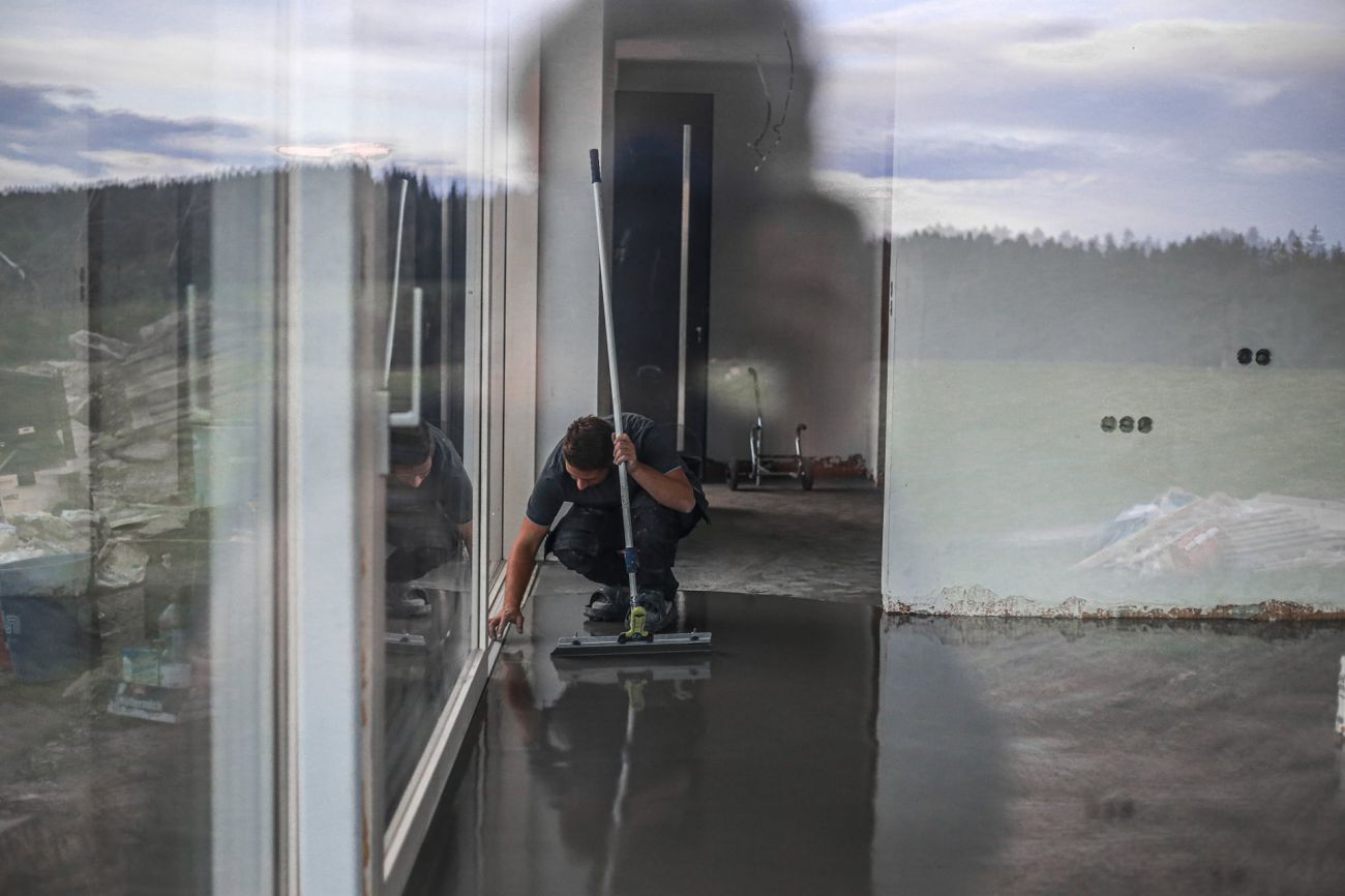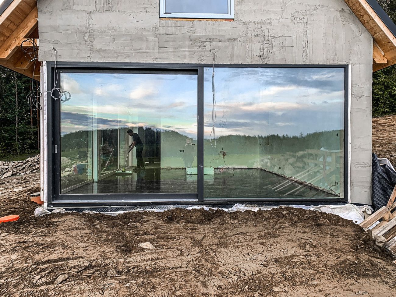 Stavba pokračuje podle plánů. Hotové jsou už podlahy i schody. V přízemí je pohledová betonová stěrka zalakovaná matným nátěrem. V podkroví a na schodech položili dělníci třívrstvou dubovou podlaha. V domě už je také zavedený internet. Hotové jsou i interiérové sádrové omítky, a tak se může malovat a uklízet.