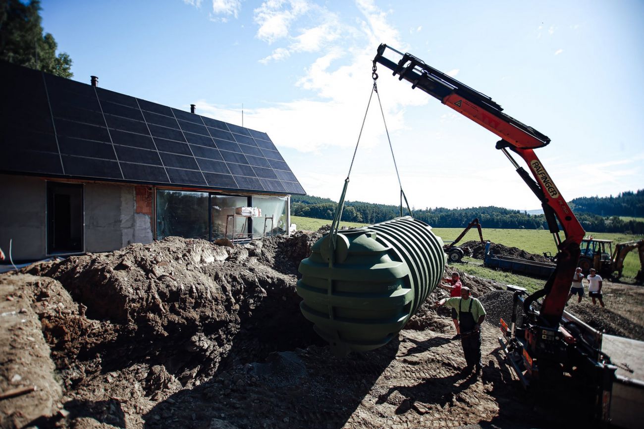 Na co se majitelé a stavaři ještě chystají, tak to je instalace nádrže na dešťovou vodu. Připravený je výkop na nádobu o objemu 16 kubíků s biologickou čističku odpadních vod. Takto velká nádrž proto, že majitelé v budoucnu počítají i s výstavbou sousedního domku, takže by nádoba byla společná. Se zavedením vody se intenzivně pracuje také uvnitř domu, zavádí se trubičky a filtry.