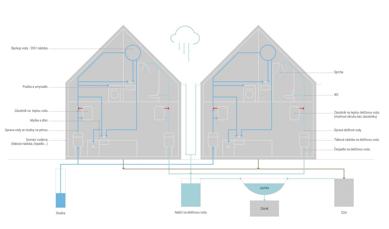 Prioritou návrhu vodního hospodářství bylo minimalizovat spotřebu pitné vody z vrtané studny na pozemku. Dešťová voda bude zadržována v podzemní nádrži o objemu 16 kubíků a nahradí tak přibližně polovinu spotřeby pitné vody v porovnání s běžným domem. Následně bude využívána pro splachování, praní, ale i sprchování.