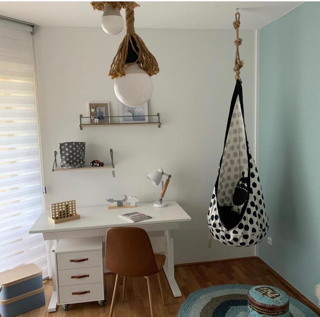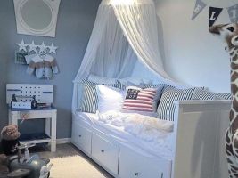 ,,Pokud jste v panelákovém bytě, kde často bývají pokoje ve tvaru nudle, využijte prostor na jeho šířku a umístěte pod okno postel. Zbyvající část místnosti zaplňte pracovním koutem, místem na hraní nebo menšími úložnými prostory. Nezapomeňte na zdi. Police, menší skříňky nebo minimálně háčky na zeď můžou také pomoct v tom, aby se ušetřilo místo na zemi. Využijte také prostor těsně nad dveřmi.