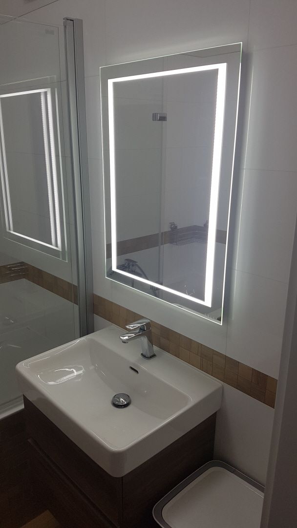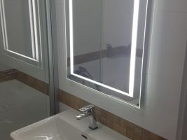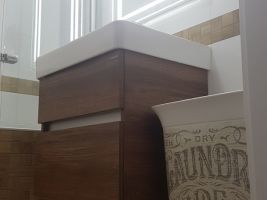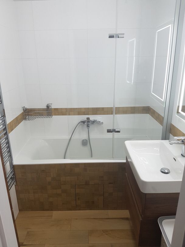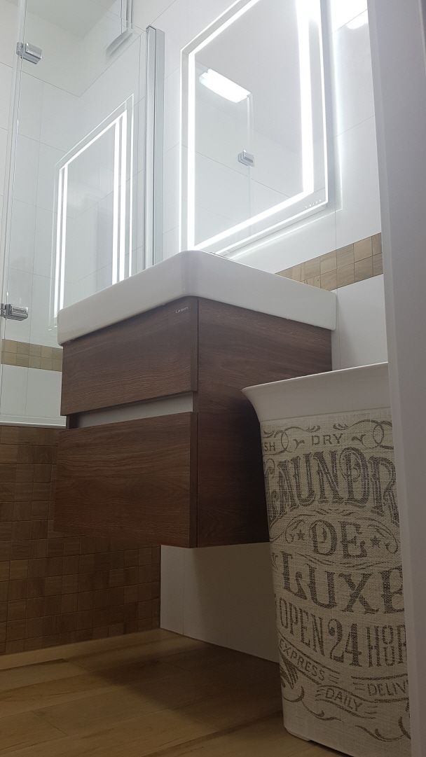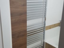 Jako zajímavý designový doplněk koupelny byla použita mozaika Cubito, která je vyrobena nařezáním ze základní "dřevěné" dlažby Faro. Sanitární technika použita v koupelně je od firmy Laufen, zástěna Hüppe, baterie Nobili, koupelnový radiátor Zehnder, zrcadlo Triga a koupelnová skříňka Lebon. I jednoduché a čisté řešení dokáže působit velice elegantním a nadčasovým dojmem.