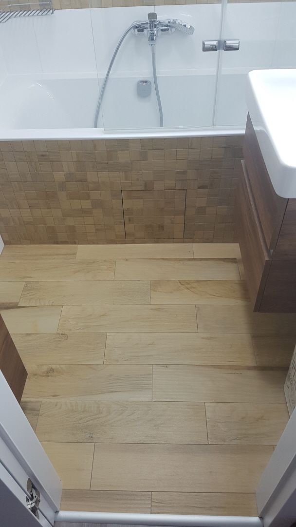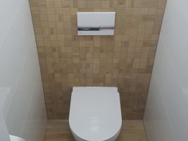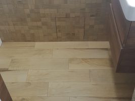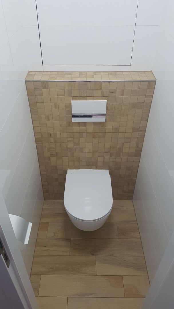 Při realizaci své koupelny a WC můžete použít jednoduchou, ale přesto velice zajímavou kombinaci bílého obkladu a dlažby s motivem dřeva.