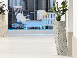 Na výrobu květináče byla použita slinutá plně probarvená dlažba, která byla osazena samozavlažovacími vložkami.