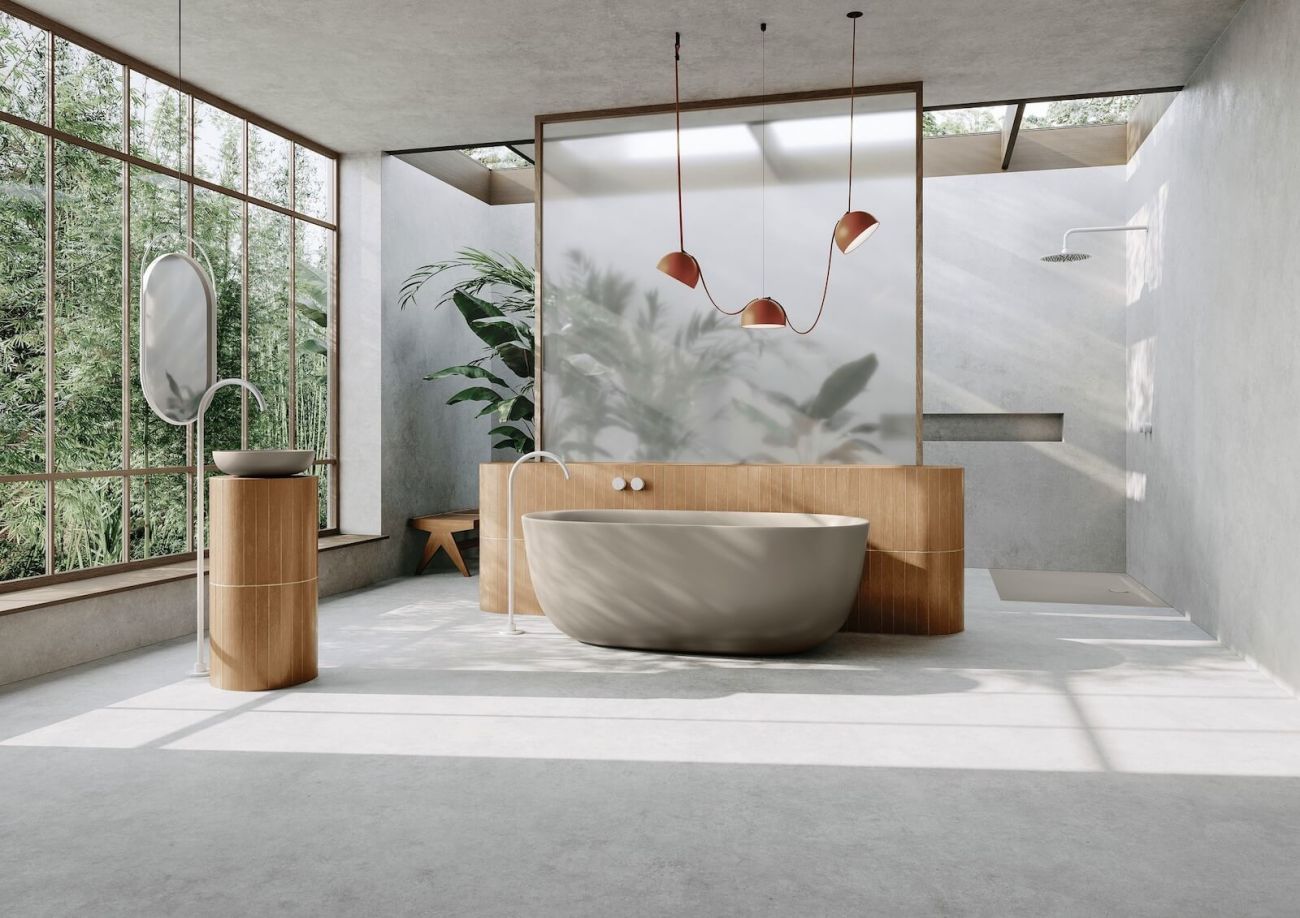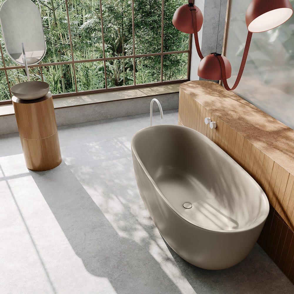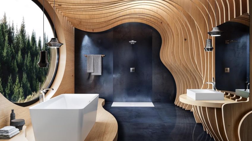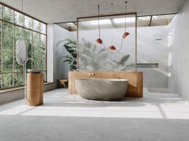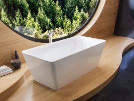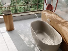 Příjemné barvy, hodně denního světla a výrobky z udržitelných materiálů, jako je dřevo, sklo a přírodní kámen, dodávají pocit klidu a pohody. Soukromá koupelna se tak změní v přírodní oázu. Udržitelnost v této koupelně odrážejí 100% recyklovatelné výrobky zhotovené z ušlechtilé smaltované oceli. Zvláštní na této koupelně je také to, že i ostatní vybavení je zcela bez plastů, a díky tomu velmi šetrné k životnímu prostředí.