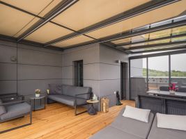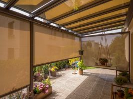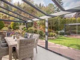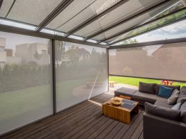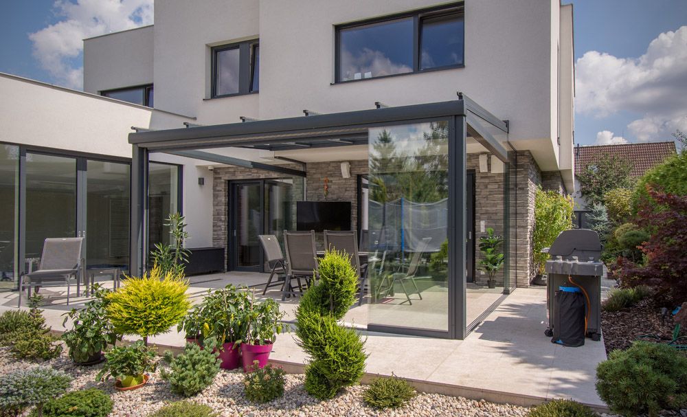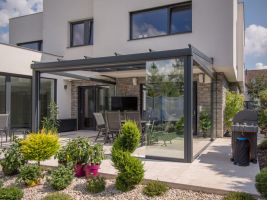Prosklené pergoly nabízejí příjemné venkovní posezení. Skleněná střecha chrání před deštěm, skleněné posuvné stěny před větrem a stínicí rolety před přehříváním. I tak jste ale stále ve spojení se zahradou.