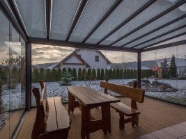 Stejně tak jako střecha jsou prosklené i stěny pergoly. Ty mohou být rámové i bezrámové. Ty bezrámové jsou prakticky neviditelné, přitom výborně chrání před chladem a deštěm. Navíc se vám ani neorosí. Boční skla díky své tloušťce a hmotnosti velmi dobře tlumí zvuky.
