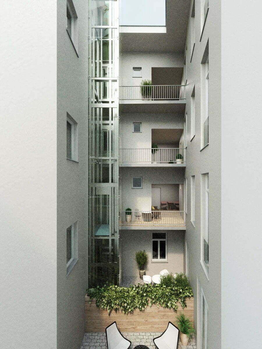 Rohový dům bude kompletně rekonstruován včetně výtahu ve vnitrobloku. Jedná se o cihlovou stavbu z roku 1836 se zachovanými prvky architektury tehdejší doby, jejichž kompletní renovace dokreslí nevšední exteriér domu. Autorem rekonstrukce je architektonické studio PLUS MÍNUS NULA.