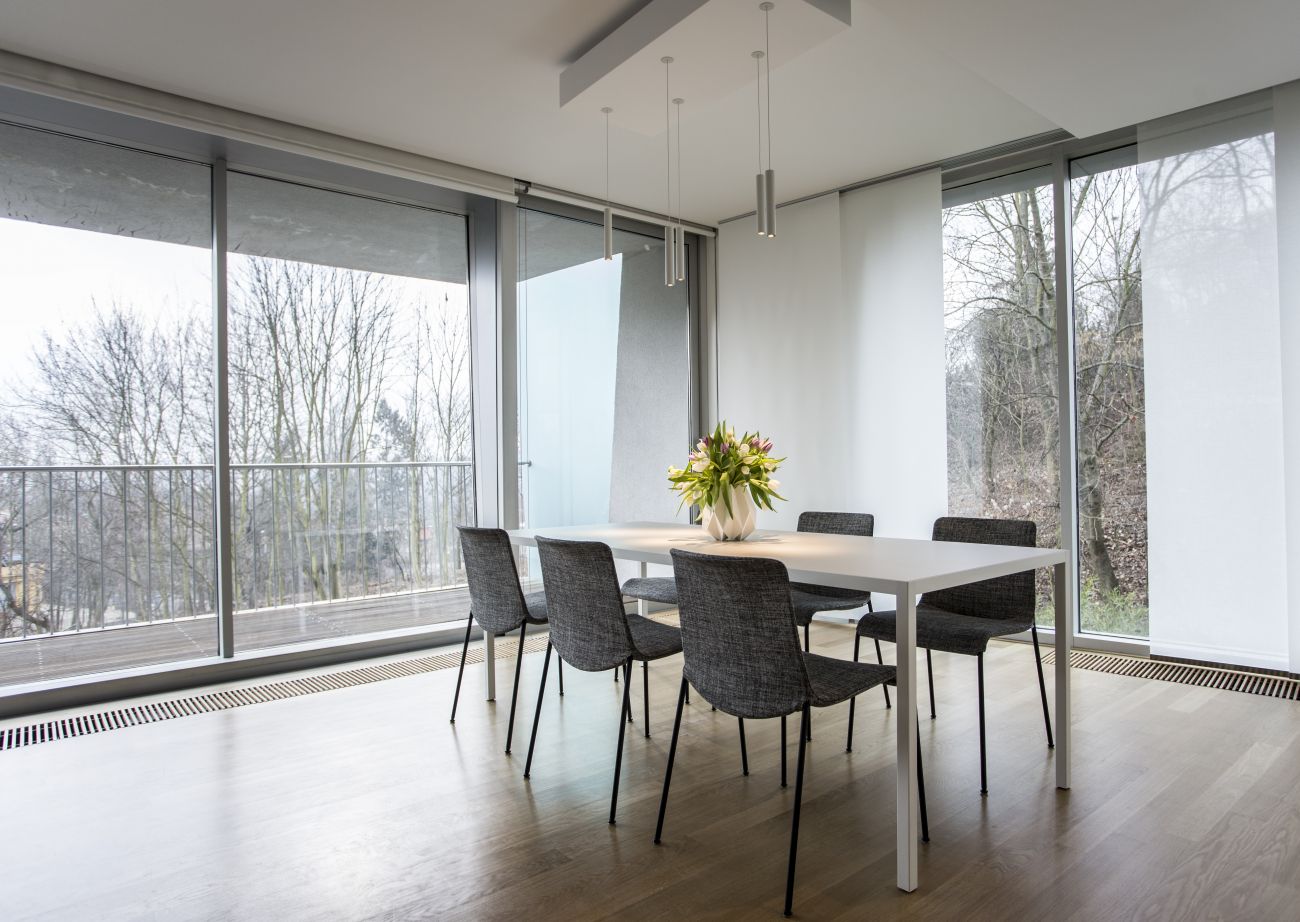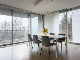 Výběr nábytku provedla architektka citlivě tak, aby ještě zvýraznila vzdušnost a celkovou transparentnost interiéru. S mírou osvětlení a určitou nahotou bytu však klient může jednoduše pracovat a navodit tak intimní atmosféru a soukromí. Další zásadní rozdíl je v barevném ladění interiéru. Pánská domácnost dovoluje i temnější nebo chladnější tóny, jako je šedivá, modrá, hnědá. Podlaha je dřevěná, rámy oken jsou kovové.