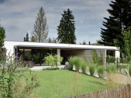 Zahrada je řešena stejným principem - méně je více. Trávník zabírá malou část pozemku a má jednoduchý obdélníkový půdorys, kolem jsou záhony s různými druhy květin a keřů. V zahradě je také umístěna retenční nádrž na dešťovou vodu, která se používá na automatickou závlahu.