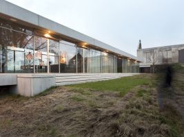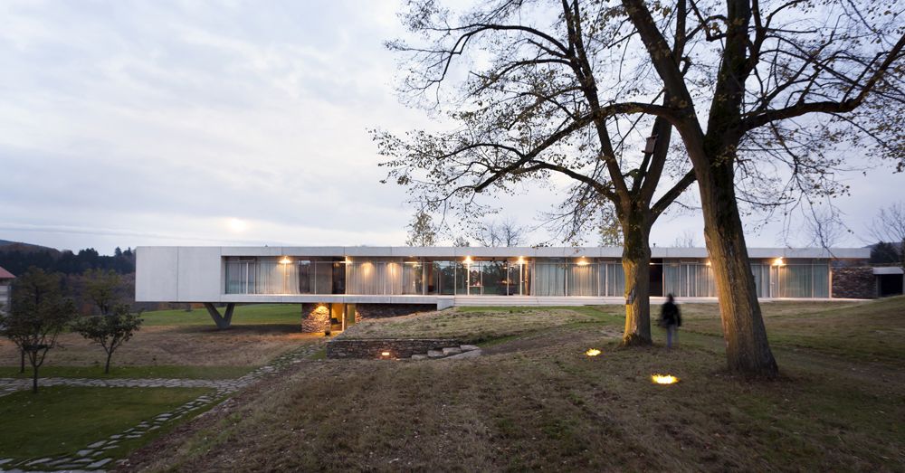 Novostavba, kde se nachází obytná část, je tvořena dominantním celoproskleným podlažím. To sedí na soklu, který je tvořen z místního kamene. Konstrukce domu je vytvořena z krytých prefabrikovaných dílců. Fasáda budovy tak představuje vizuálně minimalistický koncept 4 pruhů fasády: kámen – beton – sklo – beton, které se postupně vynořují ze svahu a vystupují nad terén.
