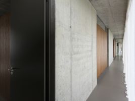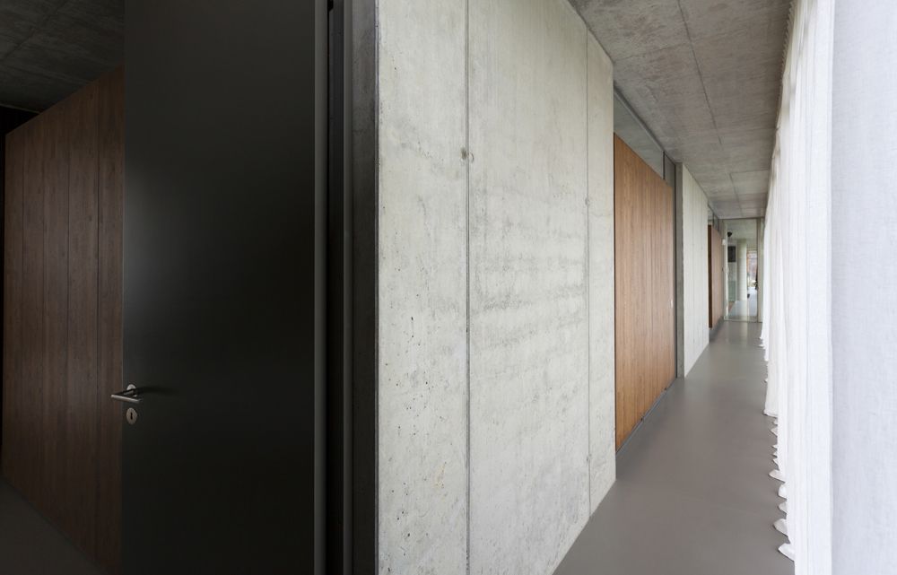 Stejně tak interiér domu je ve znamení minimalismu a čistého designu. Strop i stěny jsou z pohledového betonu, který je členěný jednotným rastrem otisku bednění. Stěny jsou prolnuty také masivním dřevem a sklem. Podlaha je litá, v kuchyni pak dřevěná.