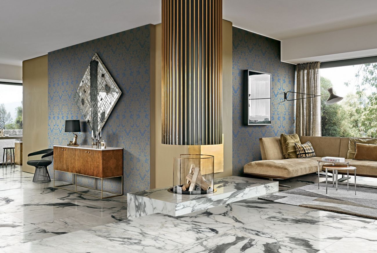 Velmi efektivně působí z takové dlaždice vytvořit umyvadlovou stěnu s designovou sanitou, a vzor pak promítnout ještě na určitých částech místnosti.