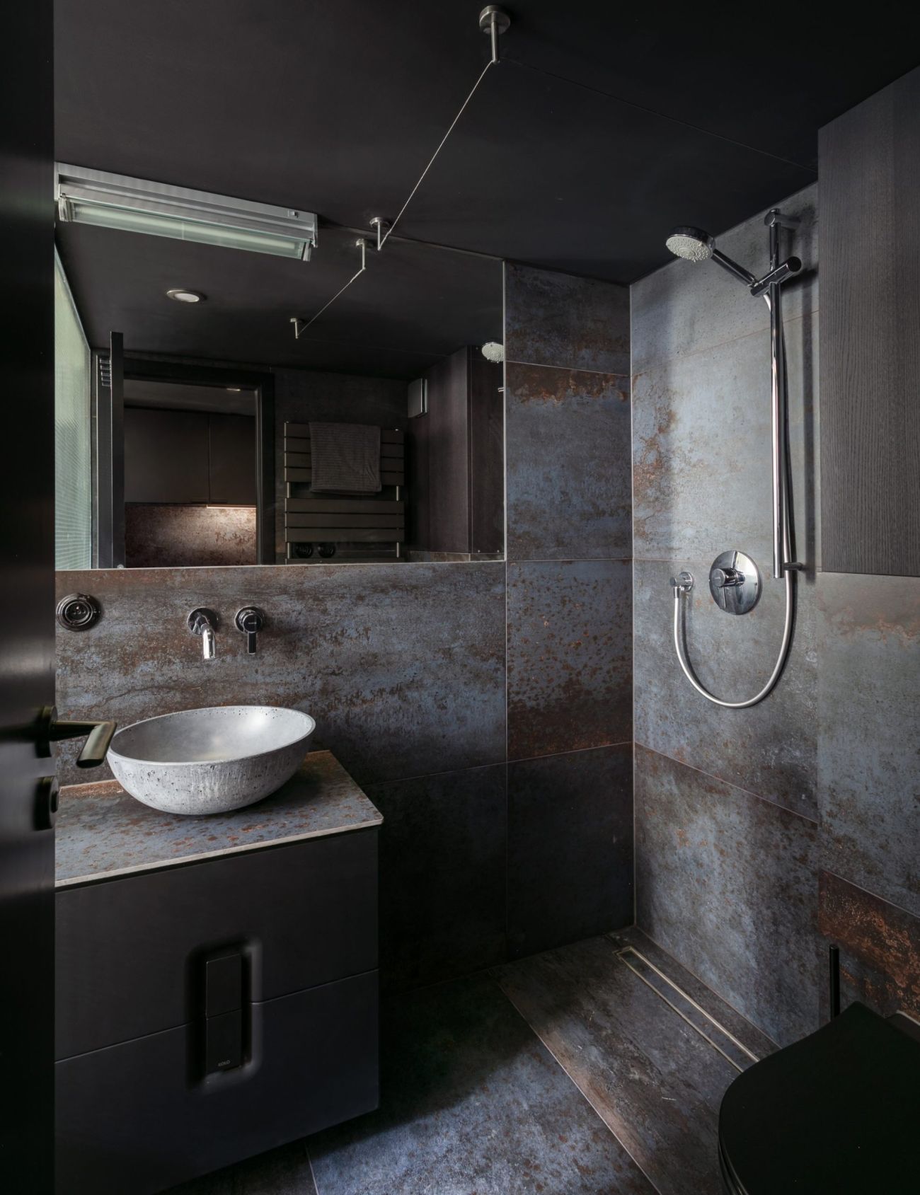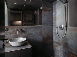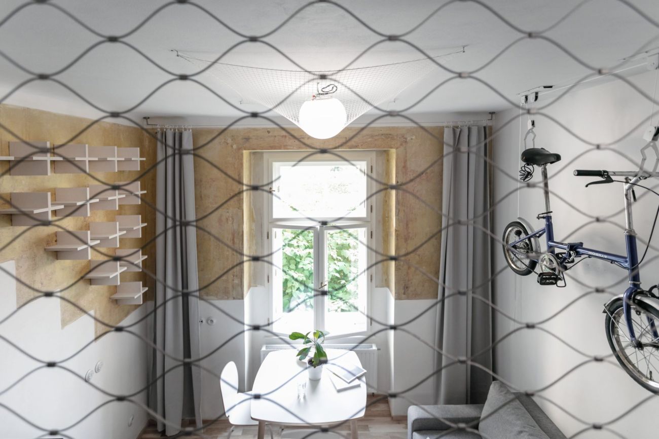 Hlavní obytný prostor je umístěn co nejblíže u okna, tedy jediného zdroje světla. Vše je zde velmi prakticky řešené, ať už se jedná o spaní v patře, úložný prostor schovaný za černé schodiště či netradičně pojatou koupelnu. “Využili jsme zde vysokých stropů a umístili spaní do patra. Koupelna se stala díky velké prosklené (drátosklo) stěně součástí prostoru. V interiéru jsou odhalené omítky, tak aby se zde stále propisovala hodnota doby vzniku tohoto bytu. Na stěnách totiž najdeme zbytky staré metody válečkování,“ říká Jakub Heidler.