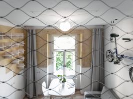 V interiéru byla využita široká škála různých materiálů jako zrezivělá ocel, nerezová síť, betonové umyvadlo, či staré keramické zásuvky. Architekti do bytu kreativně zakomponovali detaily, které místu dodávají moderní šmrnc. Jedinou bílou zeď určenou pro zavěšení obrazu zdobí městské skládací kolo s dojezdovou vzdáleností tak akorát na kraj metropole a zpět. Zasíťovaná stolní lampa u stropu je obrácenou siluetou Řípu, což odkazuje na název ulice, kde se byt nachází. Knihovna z křížů kopíruje tvar schodnic vedoucích do horní ložnice.
