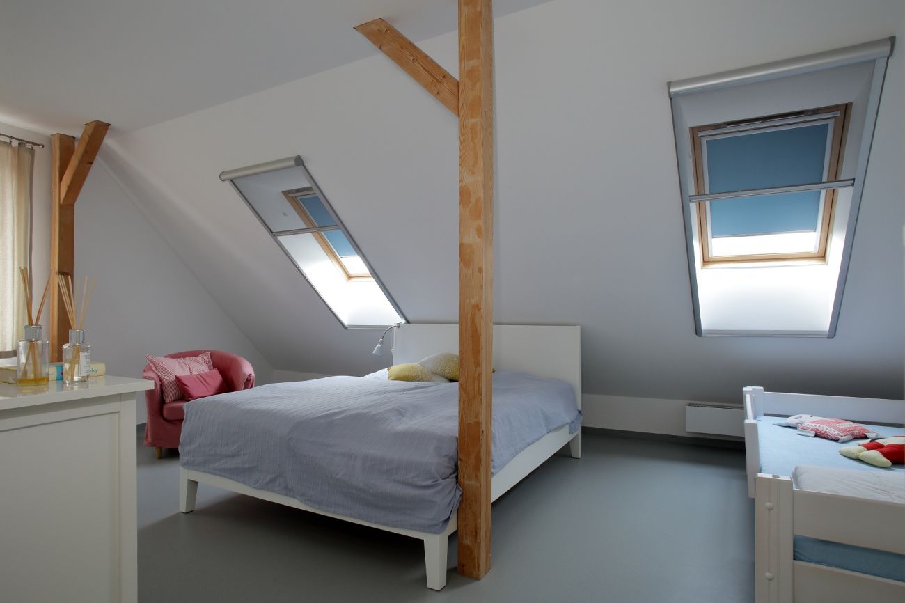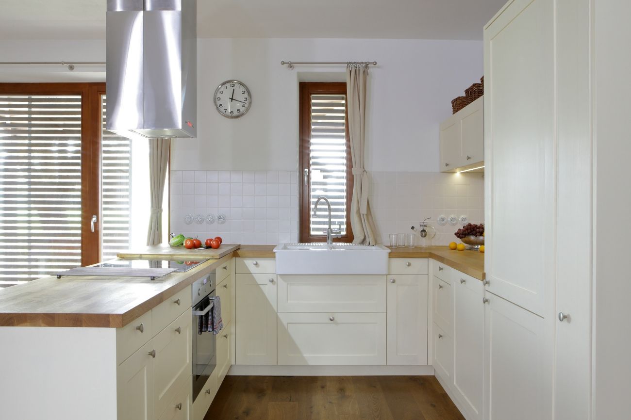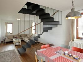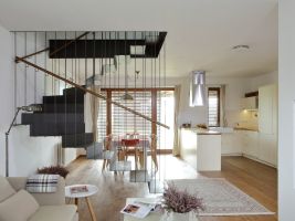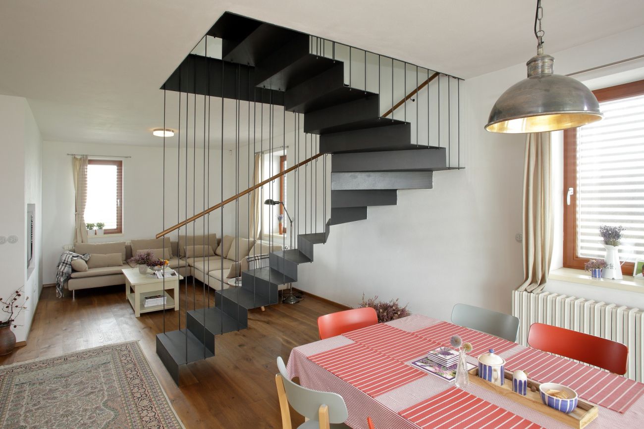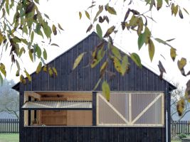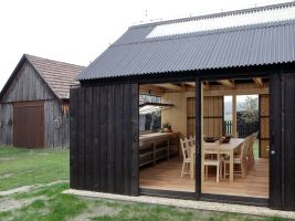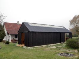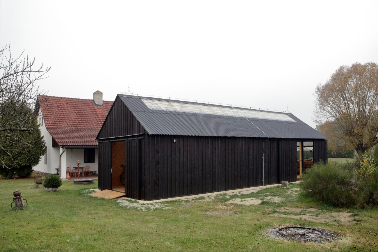 Původní stodola byla zachována, pouze doplněna o lehkou dřevěnou jednopodlažní konstrukci, která tvoří vstupní závětří a zároveň zastřešení terasy. Na sedlovou střechu domu architekti instalovali dva menší pultové vikýře. Ve vstupní fasádě pak přibyly dvě výrazné prosklené plochy. V domě se nachází také koupelna a sauna.