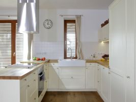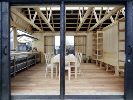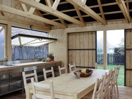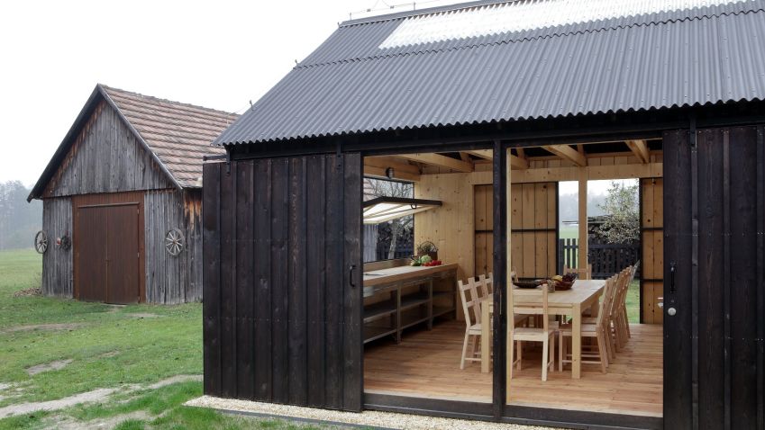 V druhé etapě byla odstraněna jedna z dřevěných hospodářských staveb. Na jejím místě vznikla nová dřevostavba, která původní dřevěný domek připomíná. Interiér je tvořen z dřevěných prvků v přirozeném odstínu smrku, fasáda je naopak tmavá. Díky posuvným dveřím lze prostor zcela otevřít a propojit se zahradou. Výrazné je pak prosvětlení prostoru shora, které zajišťují pásy transparentní střešní krytiny. Jedna část objektu slouží jako kuchyně s jídelnou, druhá pak jako sklad a kolárna.