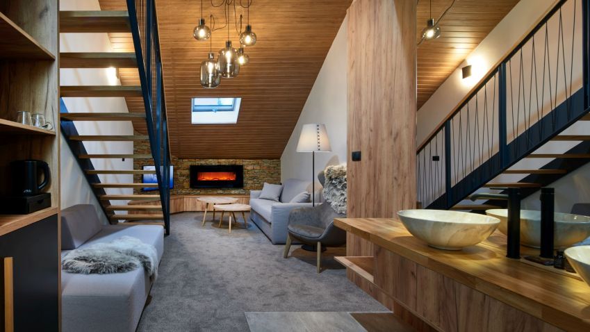 Ústředním prvkem interiéru je kamenná stěna s krbem a televizí, která spolu s pohodlnou sedačkou a designovým křeslem vytváří ve spodním patře pokoje útulný obývací prostor. Výrazným prvkem jsou zde také kamenná umyvadla se zrcadlovou stěnou s reliéfem hor.