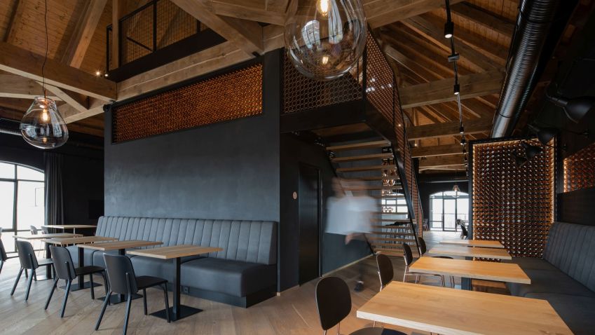 Atmosféru interiéru podtrhují materiály jako černá cementová stěrka a závěsy na stěnách, měděný barový pult a měděné designové prvky osvětlení a židlí v kontrastu s nábytkem nebo odhaleným dřevěným krovem.