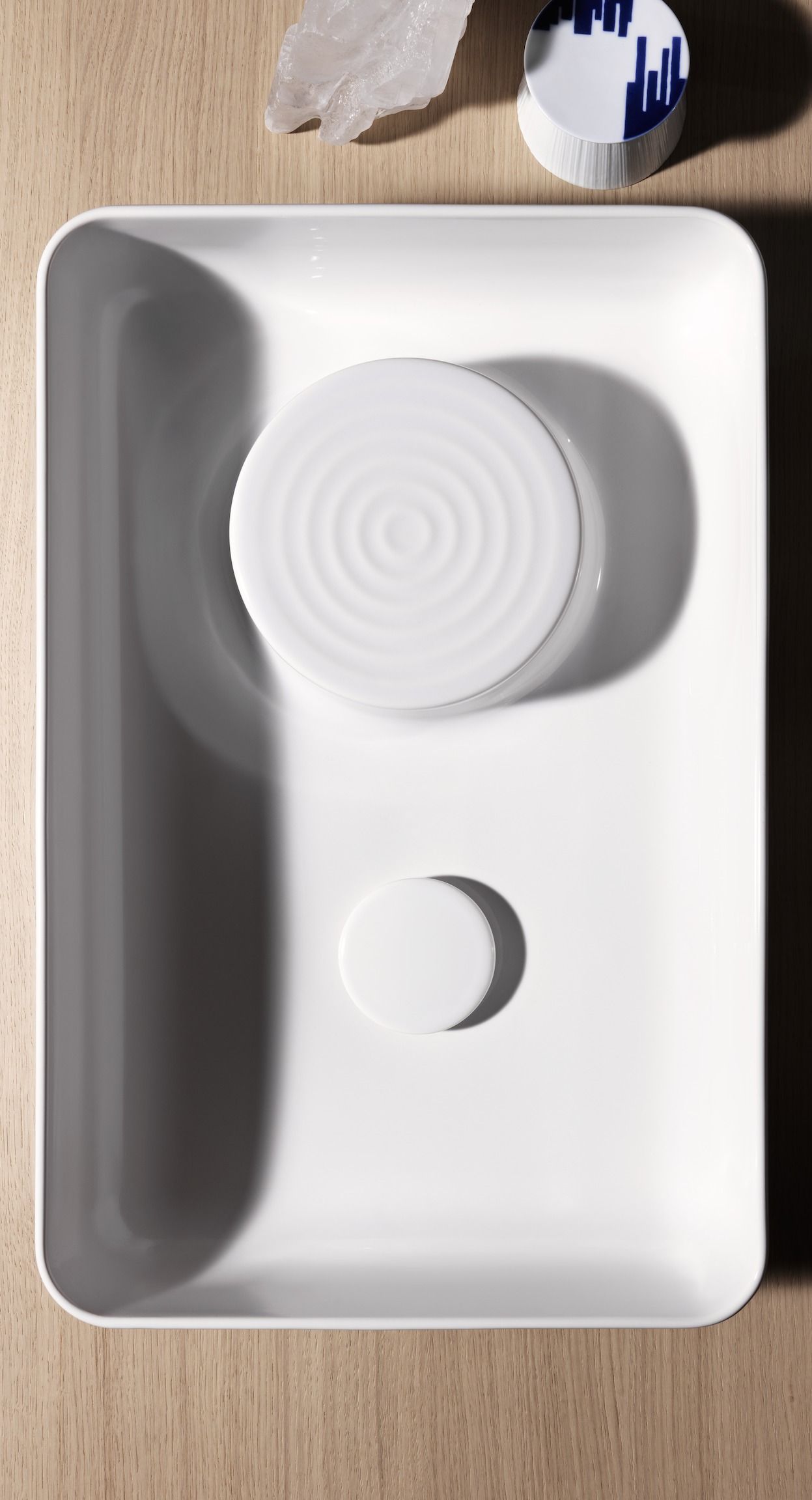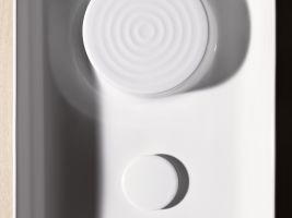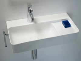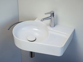 Jedno z umyvadel v kolekci je originální v tom, že je kruhové, ovšem kontrastním prvkem je pak hranatá odkládací plocha na obou stranách. Keramiku je v tomto případě možné také řezat a uzpůsobit dokonale prostoru, který je k dispozici. Pro ještě větší variabilitu pak nabízí umyvadlo obě varianty umístění baterie a ploch – vpravo i vlevo.