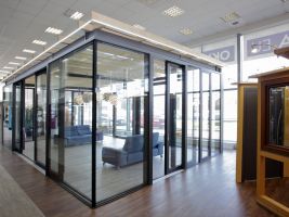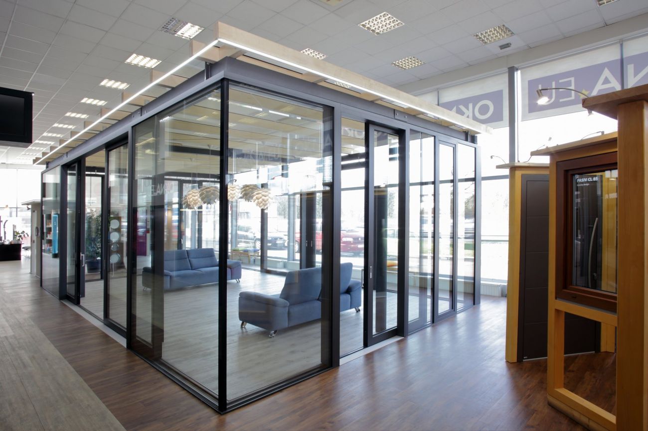 Na ploše více než 1000 m2 si zákazníci i architekti mohou prohlédnout celoprosklené rohy, bezrámová zasklení, bezprahová řešení otvíravých dveří a posuvných portálů, velkoformátové HS portály se skrytými křídly a další detaily bezrámového řešení s možností elektrických posuvů a to v hliníkových profilech Schüco i Heroal s bezrámovými efekty nebo ve zcela bezrámovém řešení.