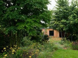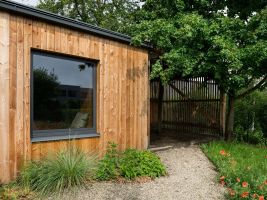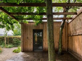 Výsledkem je minimalistický domek, který má tři oddělené části – saunu, odpočívárnu a terasu. Domek je situovaný tak, aby na konci protáhlého pozemku vytvořil protipól rodinnému domu a zároveň jakousi optickou clonu oproti okolní zástavbě.