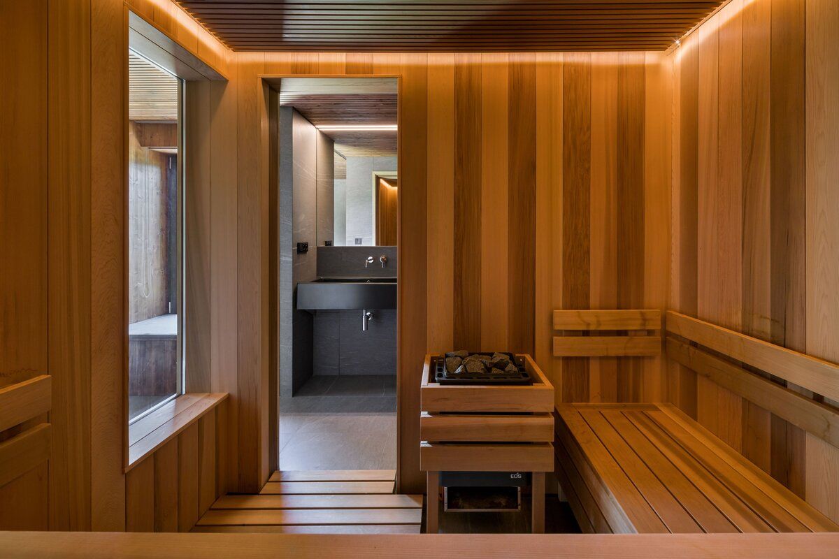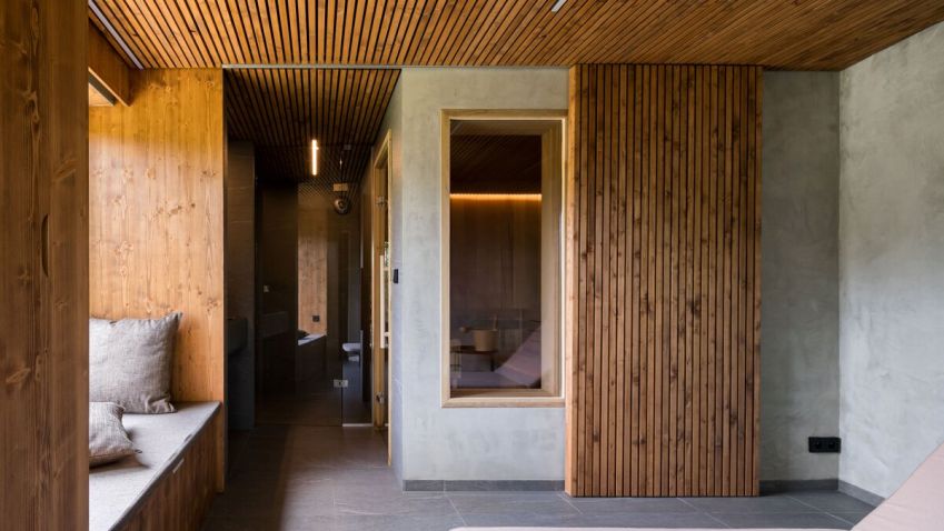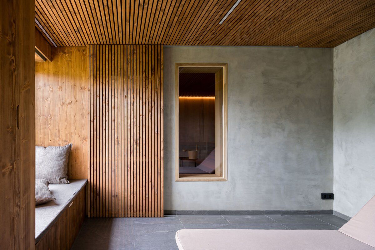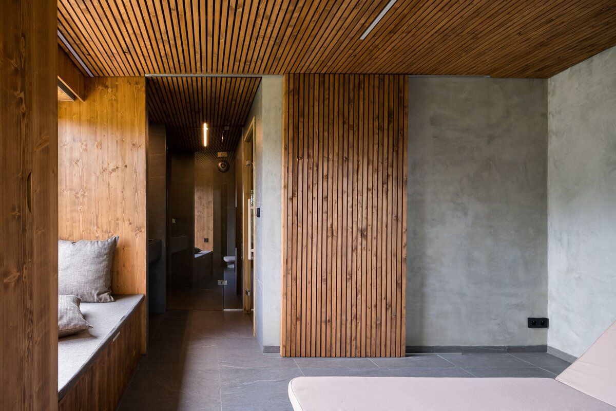 Tmavá dlažba na podlaze odkazuje k břidlici, v interiéru je použité cedrové dřevo, které patří k tradičním materiálům saun.