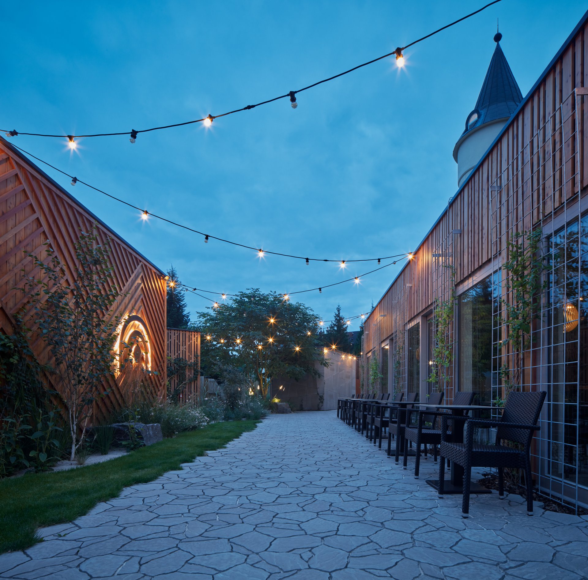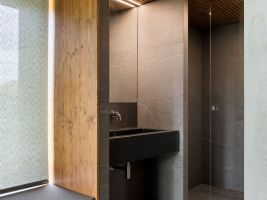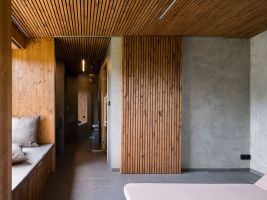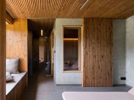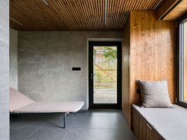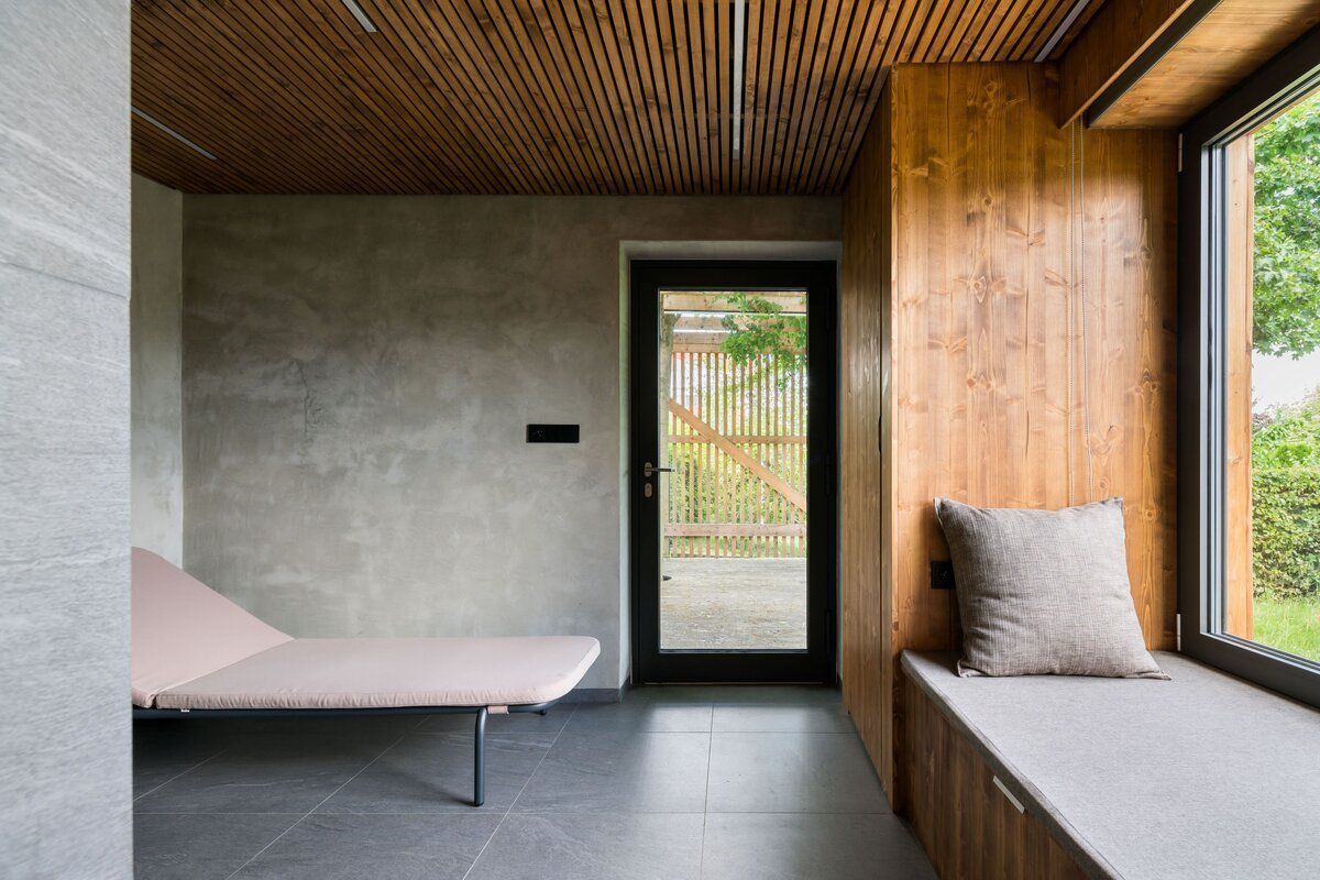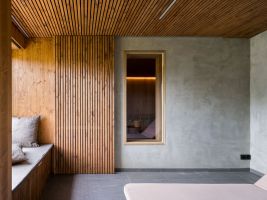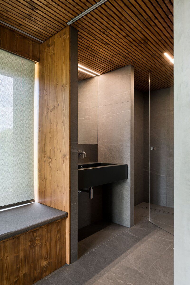 Tmavá dlažba na podlaze odkazuje k břidlici, v interiéru je použité cedrové dřevo, které patří k tradičním materiálům saun.