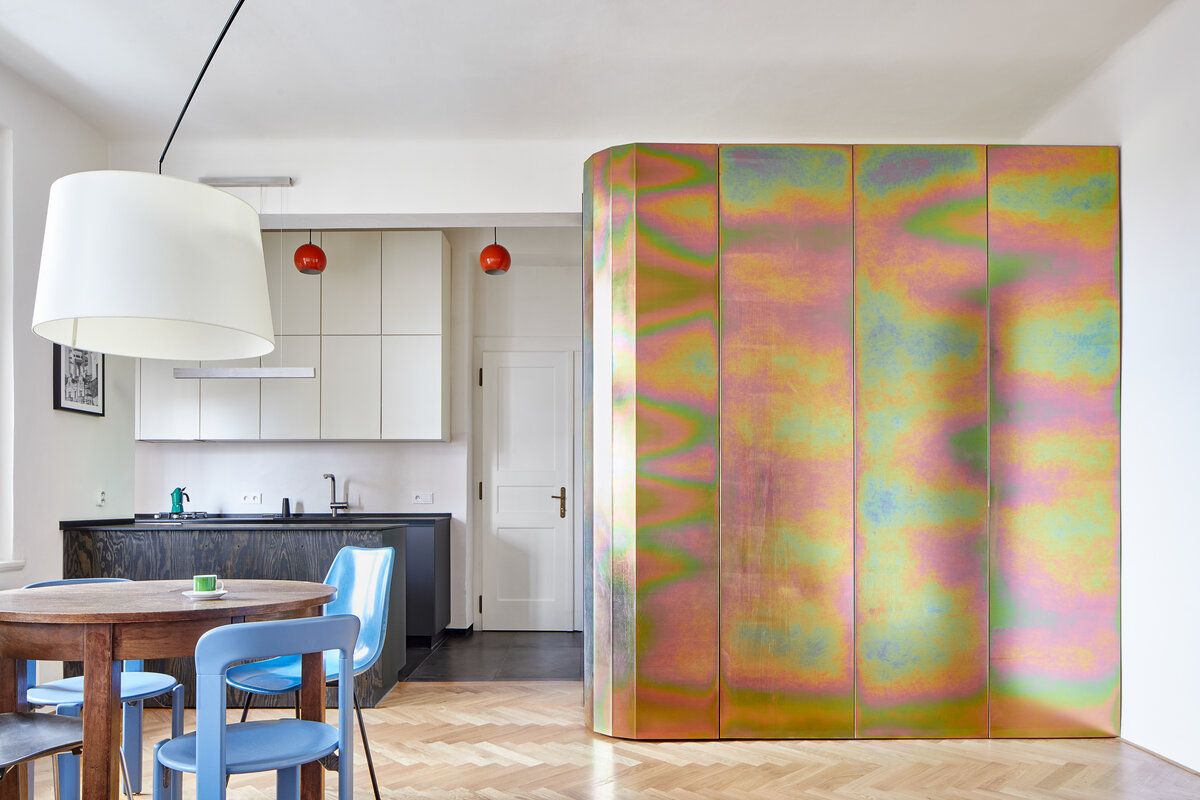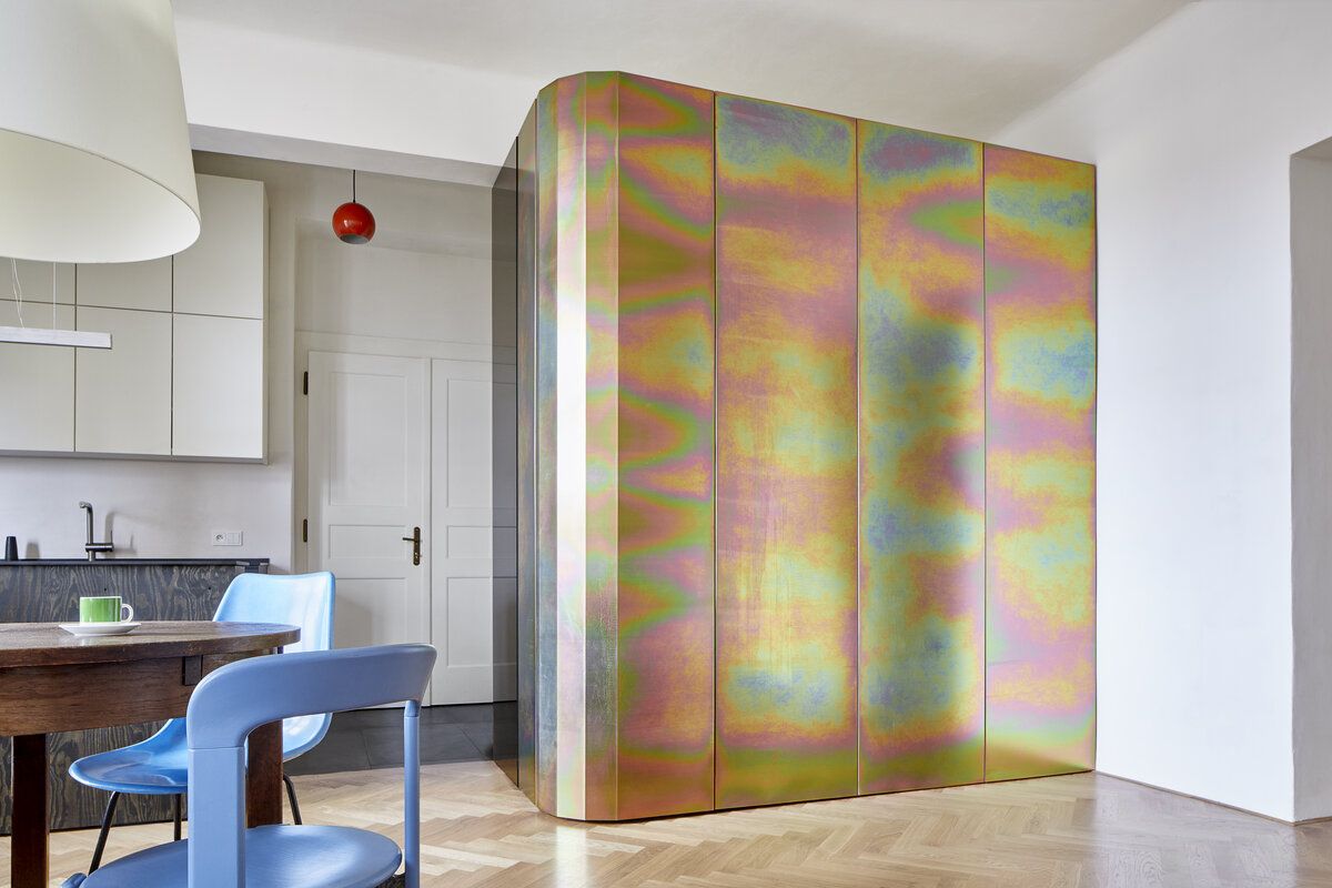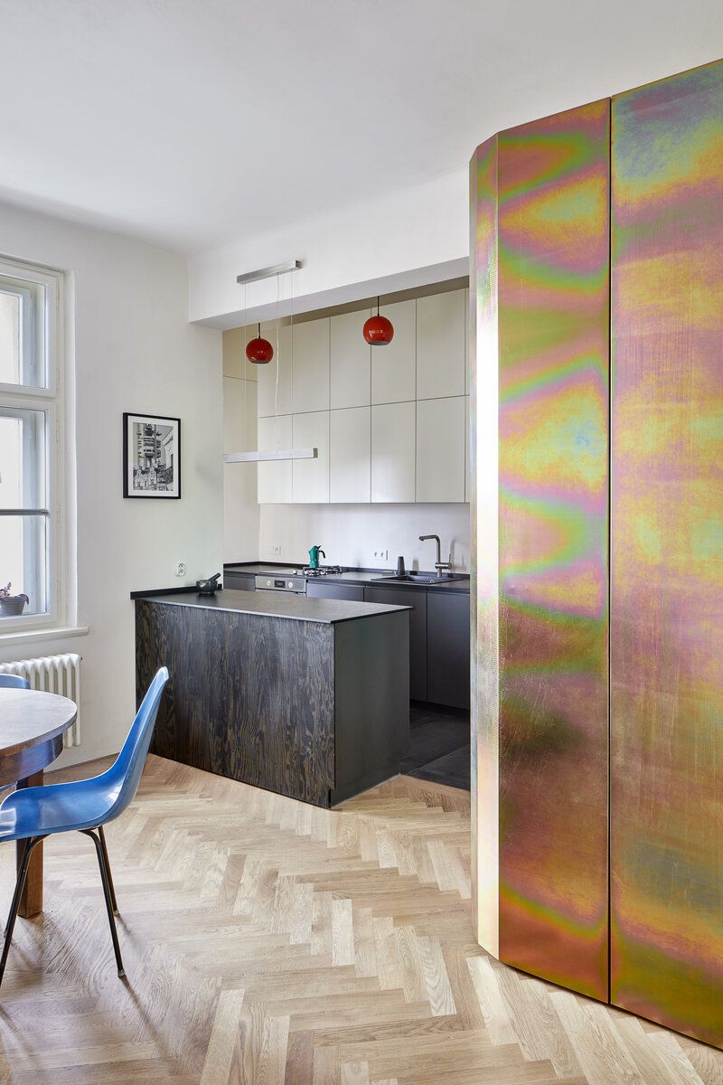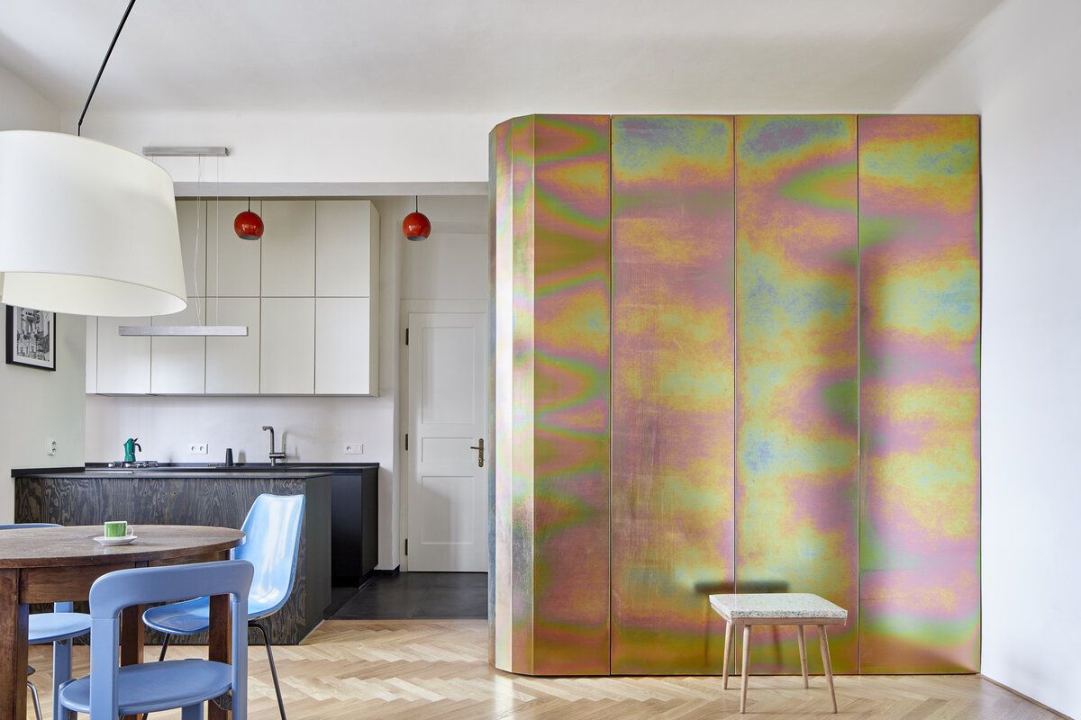 Kompletní rekonstrukce bytu v historické zástavbě v Praze 4 znamenala především změnu původní nevyhovující dispozice z první poloviny 20.století. Návrhu se ujali architekti Ondřej Janků a Lenka Kucháreková ze studia COLLARCH a výsledkem je zajímavý prostor, jemuž dominuje šatní skříň osazena dveřmi z galvanicky pozinkovaného plechu a efektem olejových skvrn. Interiér ale skrývá i další zajímavosti.