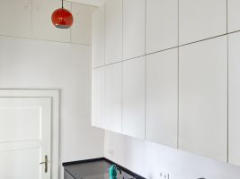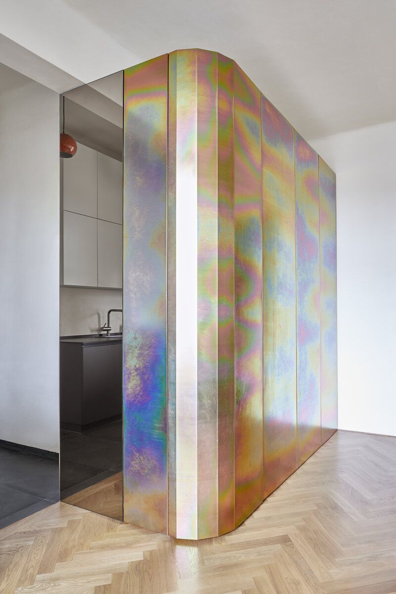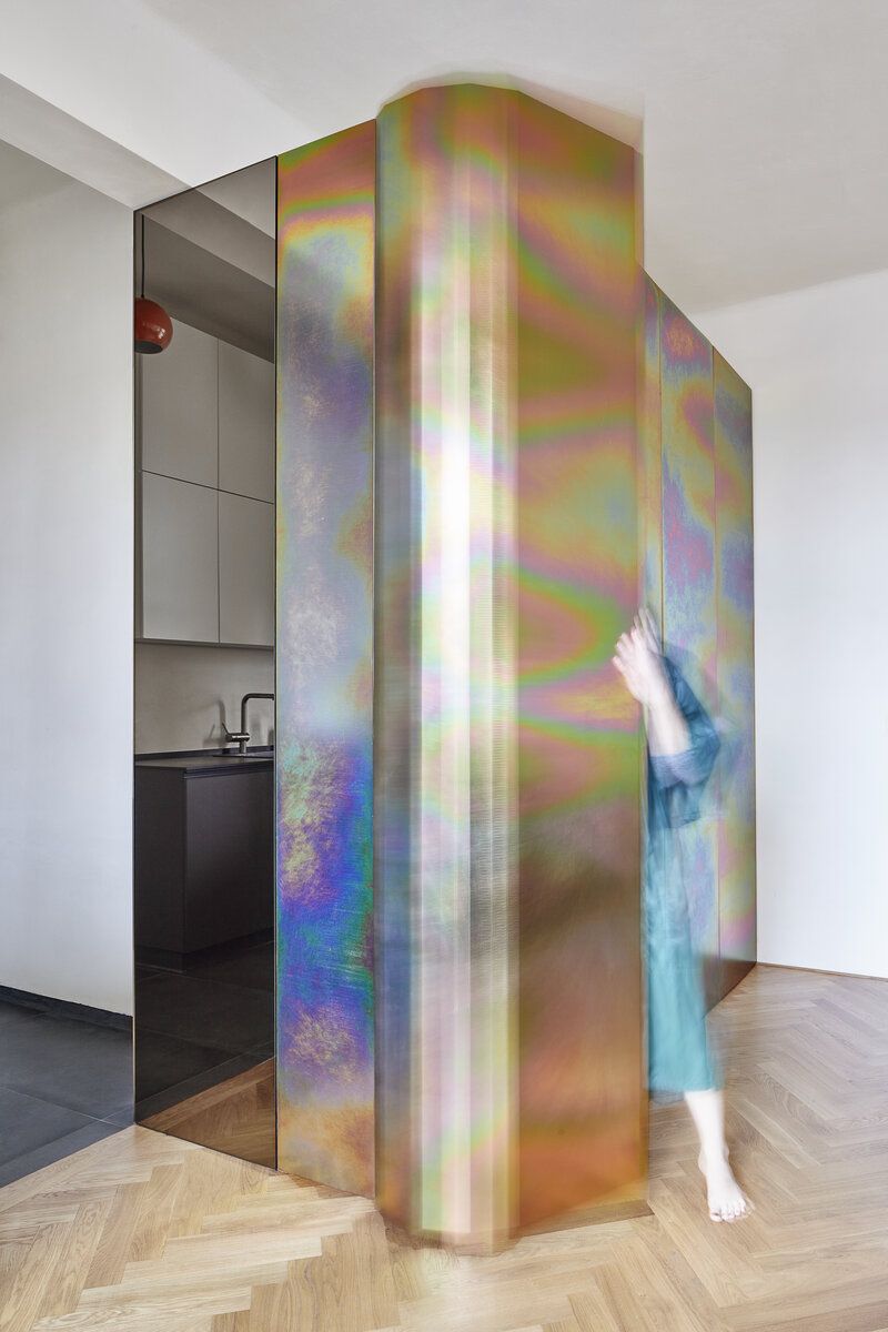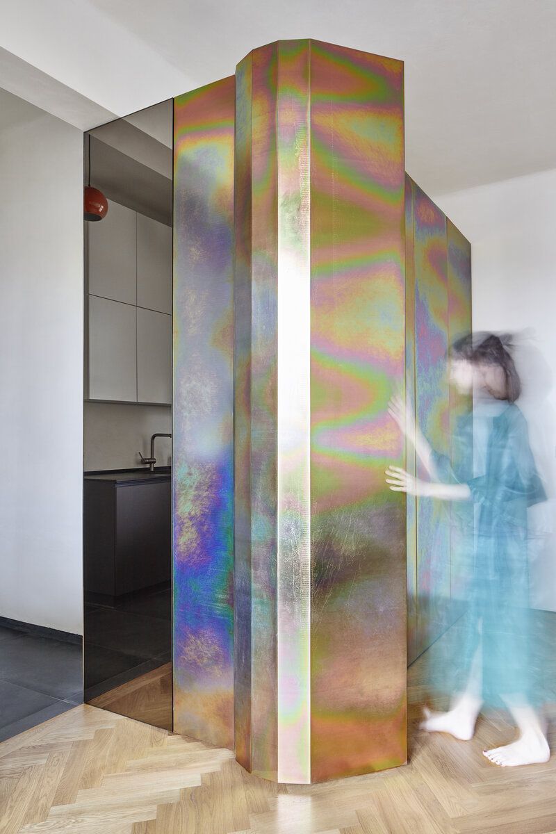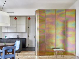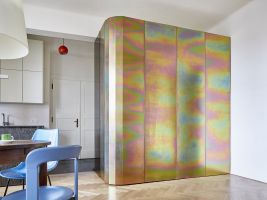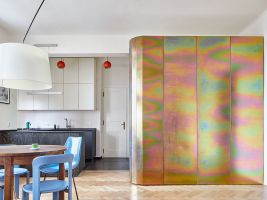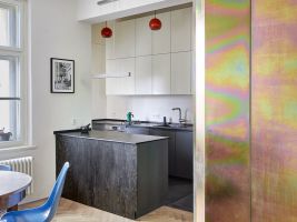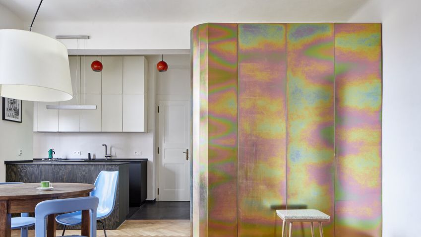 Kompletní rekonstrukce bytu v historické zástavbě v Praze 4 znamenala především změnu původní nevyhovující dispozice z první poloviny 20.století. Návrhu se ujali architekti Ondřej Janků a Lenka Kucháreková ze studia COLLARCH a výsledkem je zajímavý prostor, jemuž dominuje šatní skříň osazena dveřmi z galvanicky pozinkovaného plechu a efektem olejových skvrn. Interiér ale skrývá i další zajímavosti.