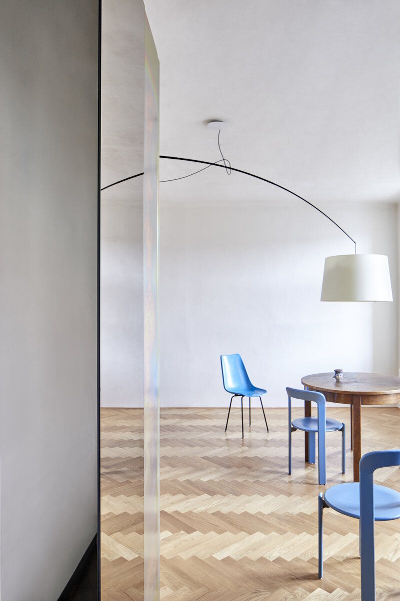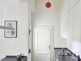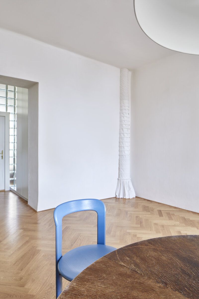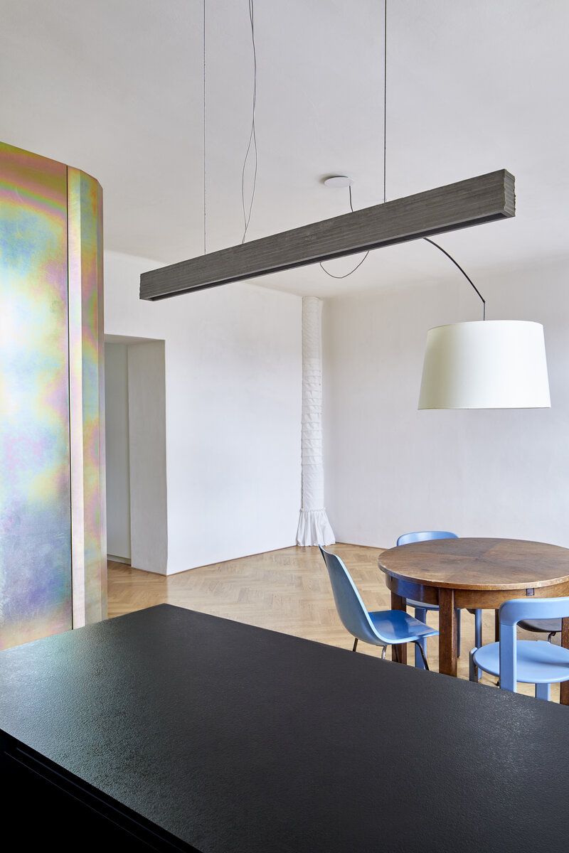 V interiéru bytu je řada dalších netypických prvků z dílny majitelů: betonové závěsné svítidlo, skříňové úchytky. Byt je citlivá kombinace původního historického interiéru se současným a lehce experimentálním charakterem nově vložených prvků.