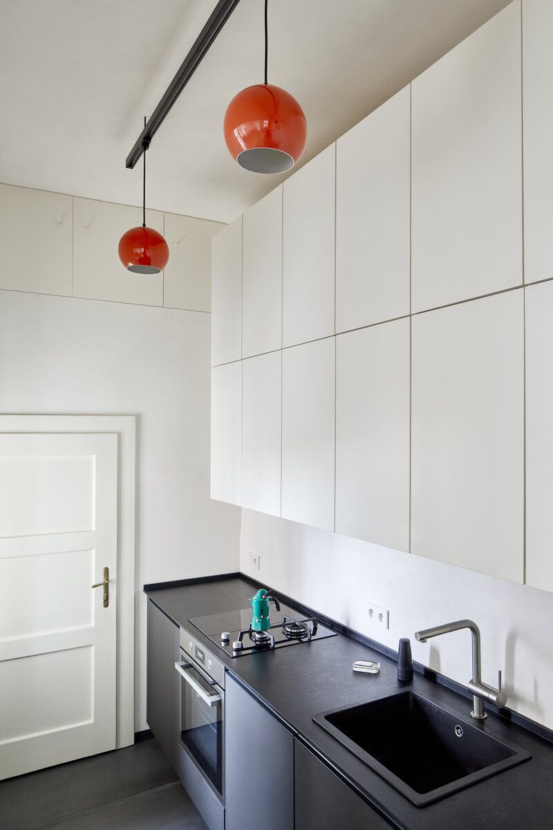 Nestandardně vysoké kuchyňské skříňky slouží jako sezonní úložný prostor pro celý byt. Stejně tak prostor nad WC přístupný z kuchyně. Linka s pracovní deskou je černo-šedá. Opticky ladí s podlahou kuchyně.