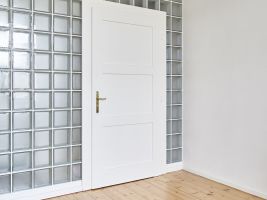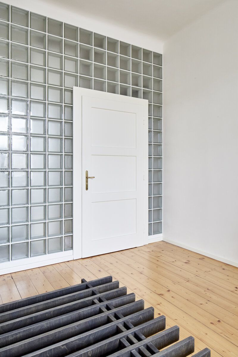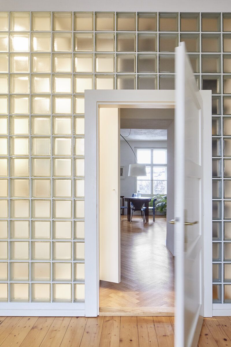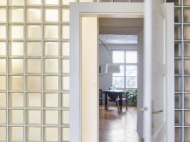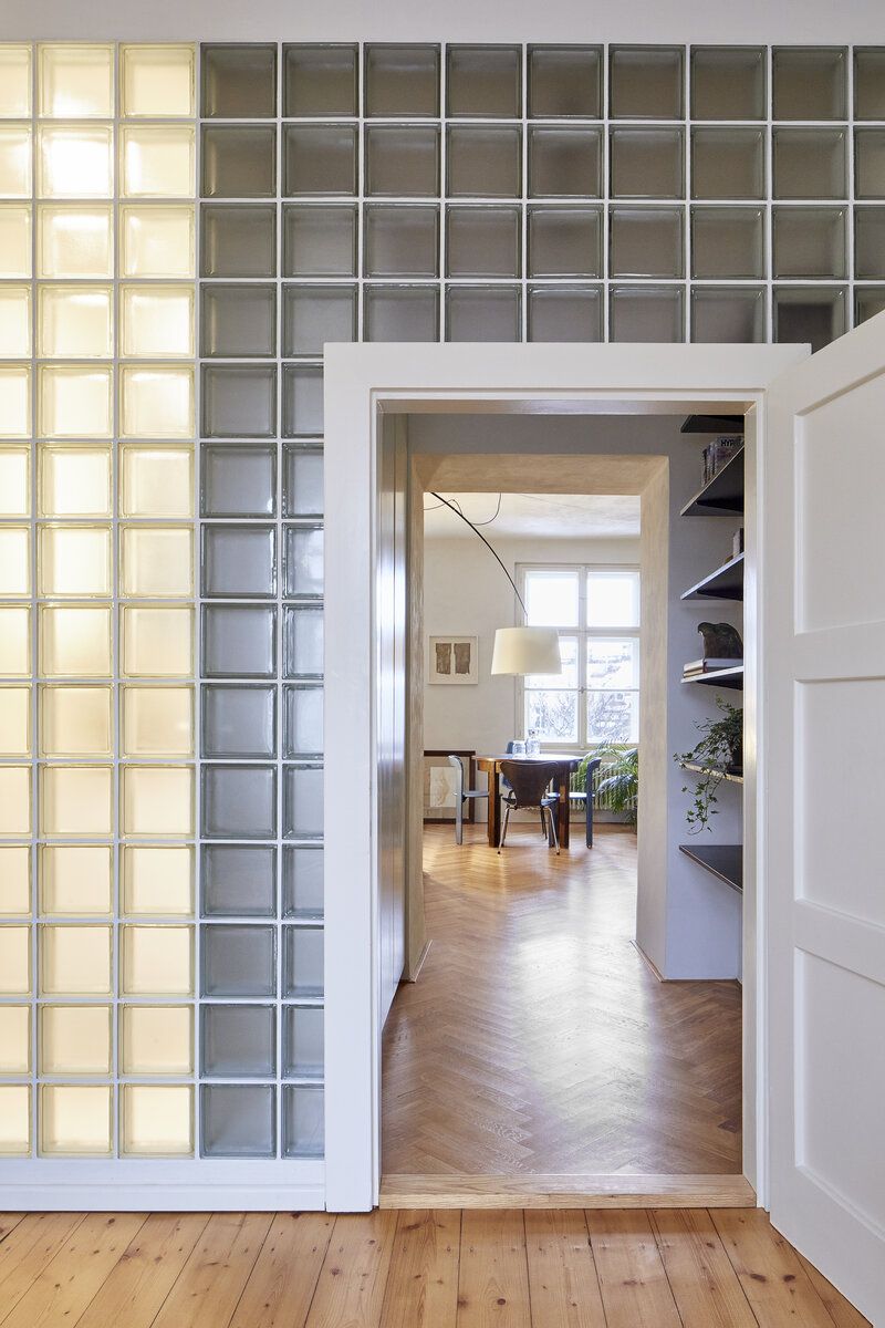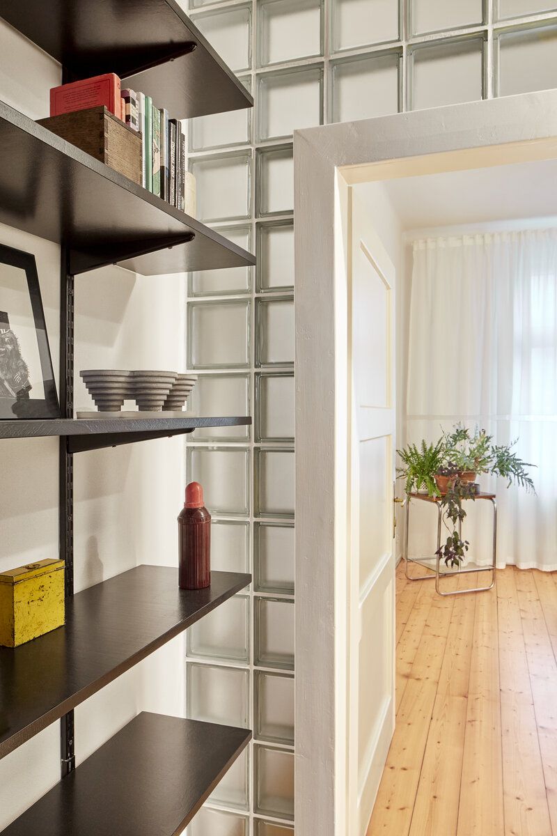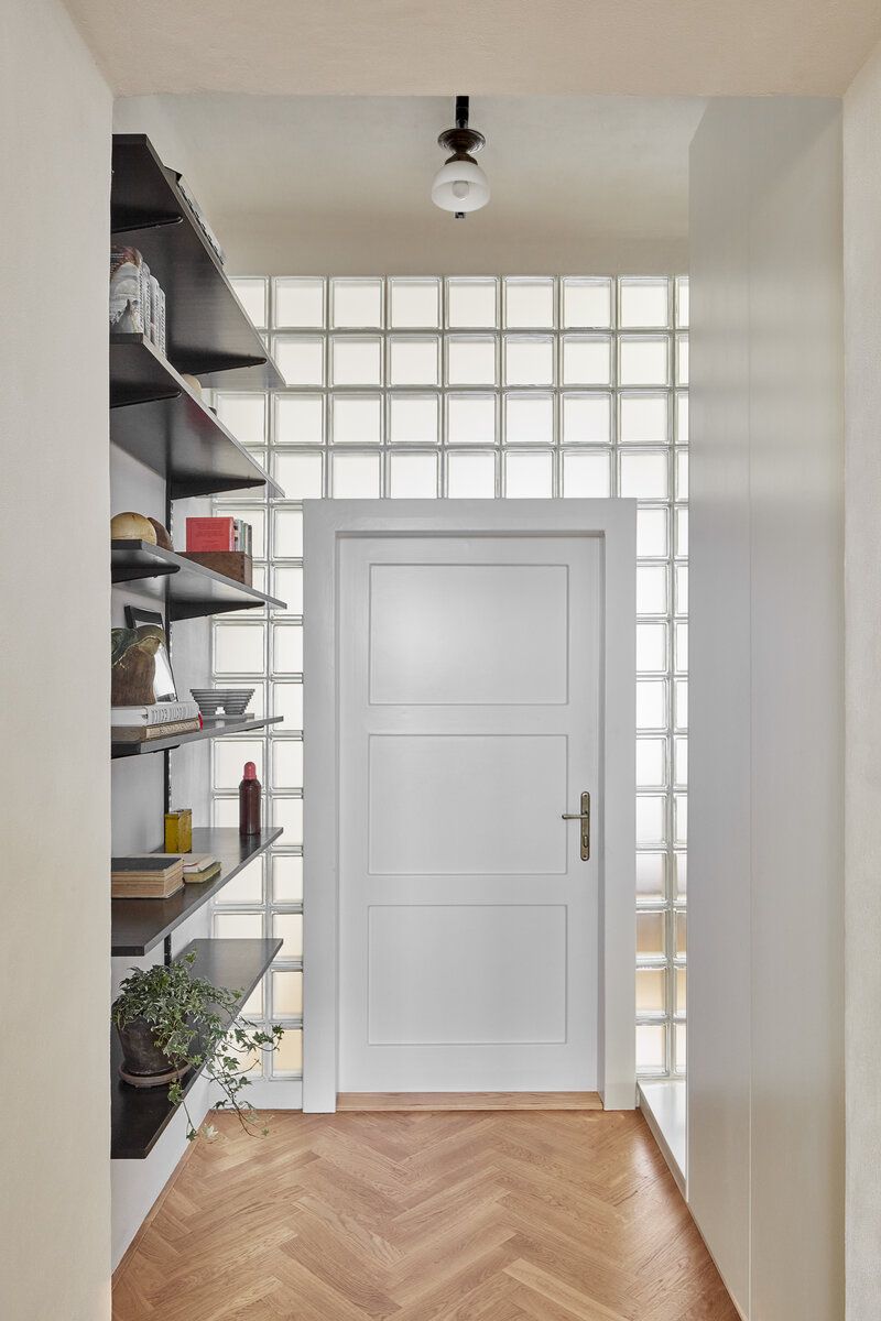 Dlouhý, ale úzký obývací pokoj je nově rozdělen na ložnici, koupelnu a knihovnu. Jedna z příček, která odděluje ložnici od koupelny, byla nahrazena luxferami. Stěna uprostřed dispozice tak vpustila do bytu dostatek přirozeného denního světla. Skleněné tvárnice jsou pískované, a zajišťují tak dostatek soukromí v koupelně.