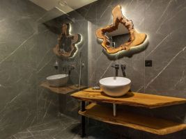 Stavba není sen - Javor apartmán - Koupelně v horském apartmánu dominují zcela unikátní dřevěné kousky