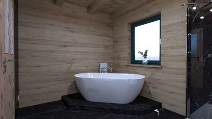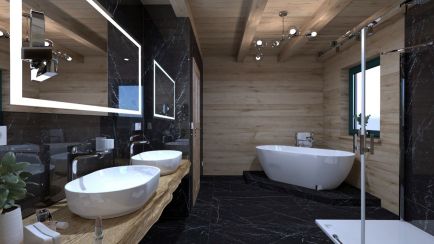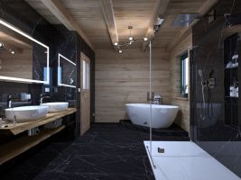 Kombinovat lze mnoho prvků, někdy nemusí vadit ani kombinace dřevěných trámů s materiály jako třeba mramor či nerez. Kvalitní sanitární předměty vyniknou totiž i na roubené stěně, protože dřevo je velice tolerantní materiál. Například do šumavské roubenky firma ProCeram navrhla moderní koupelnu, kde zkombinovala design dřeva Planches de Rex s černým mramorem ze série Black Marble v designu Marquinia.
