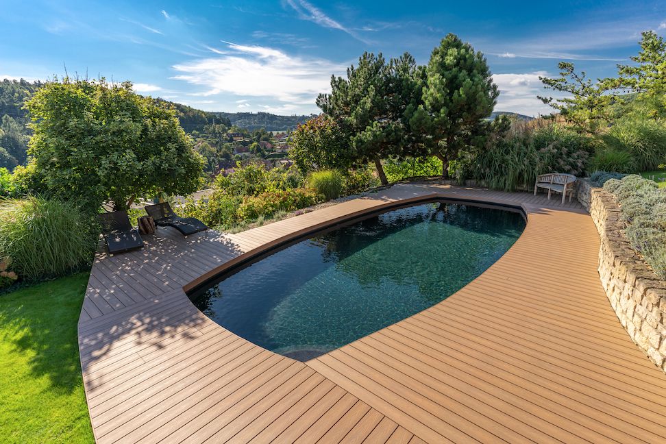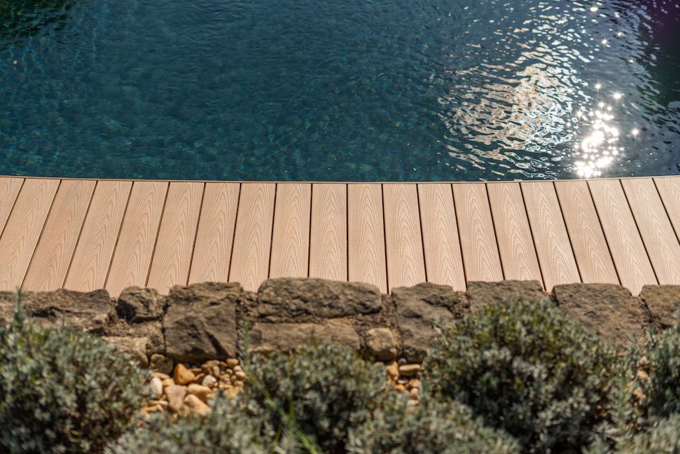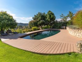 Při bližším pohledu je zřejmé, že neobvyklý tvar bazénu, který je navíc ještě situován do mírného svahu zahrady, byl pro návrh i samotnou realizaci terasy zcela určující. Jednotlivé plochy osazené nepravidelně kladenými prkny na sebe navazují a zdůrazňují krásu a radostný rytmus celého místa. Zároveň poukazují i na sepjetí bazénu s bezprostředním okolím, včetně výhledu do údolí, vzrostlé zeleně i nedaleké zídky. Dokonale přesného lemování okrajů bazénu i samotné terasy bylo docíleno opatrným nahřátím kompozitních prken a jejich pečlivým vytvarováním do požadovaných oblouků.