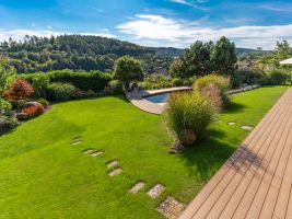 Dominantou mírně svažité jižně orientované parcely je rodinný dům na jejím vrcholu. Další přirozené centrum zahrady se pak soustředí v její spodní části kolem vodní plochy bazénu. Obě klíčová místa lemují nové atraktivní terasy, ale zatímco ta, která svými pravými úhly bezprostředně navazuje na obytnou část domu, působí záměrně jako co nejpřirozenější pozvánka do zahrady, terasa s atypicky kladenými prkny kolem bazénu zaujme na první pohled.