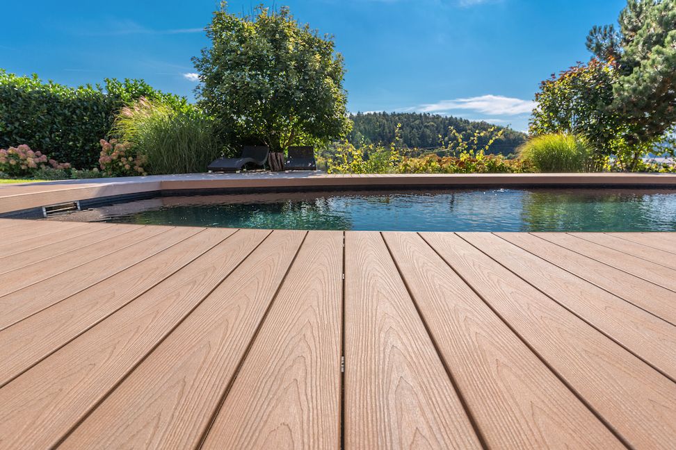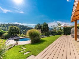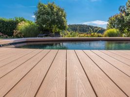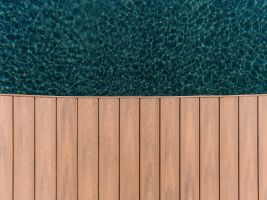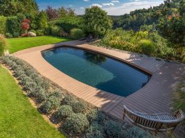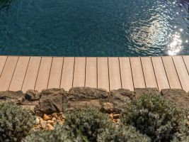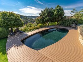 Jak v případě terasy u domu, tak i té u bazénu padla nakonec volba na prkna Natur Plus v barevném odstínu Teak. Zákazníkům se líbila kresba povrchu s přírodním vzhledem a jemným probarvením, které koresponduje s celkovým konceptem zahrady i s jižní orientací pozemku. V případě terasy u bazénu hrála při volbě barvy prken svoji roli i skutečnost, že vnitřní prostor bazénu je opatřen méně obvyklou tmavou fólií. A právě s ní a s okolní zelení ladí podle majitelů teakový odstín nejlépe.