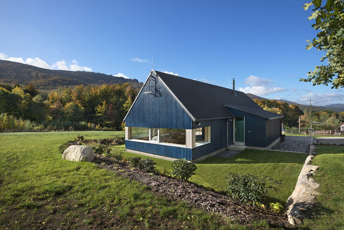 Chata v Jizerských horách zaujme fasádou z tmavě modrých prken