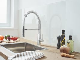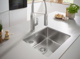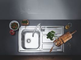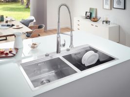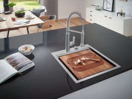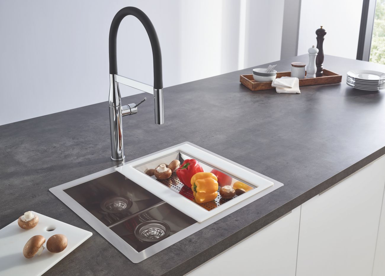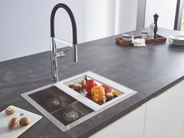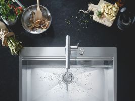 Společnost GROHE představila poprvé kuchyňské dřezy. Společnost navrhla dřezy tak, aby bylo možné je esteticky a funkčně zkombinovat s dalšími kuchyňskými bateriemi a systémy GROHE.