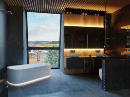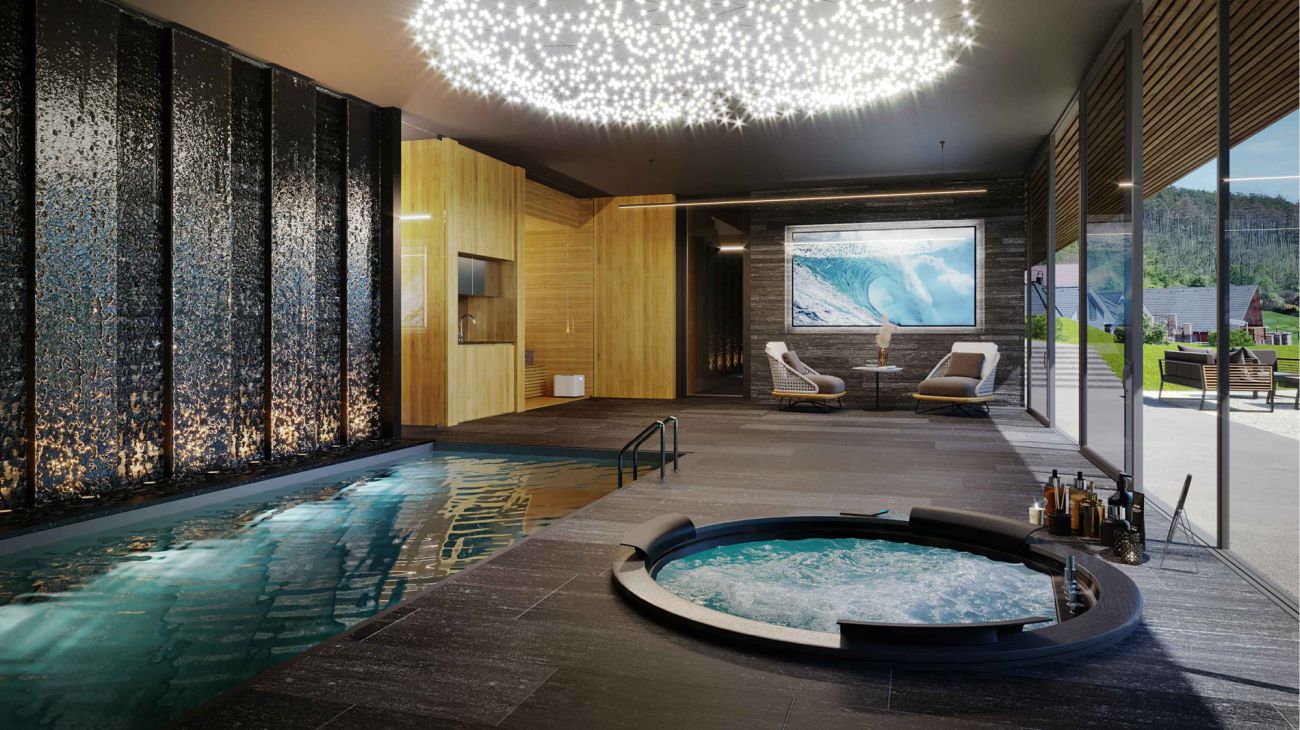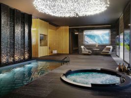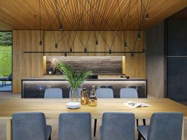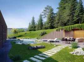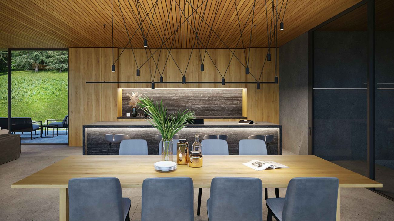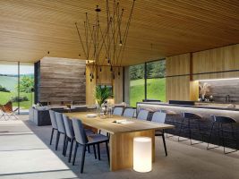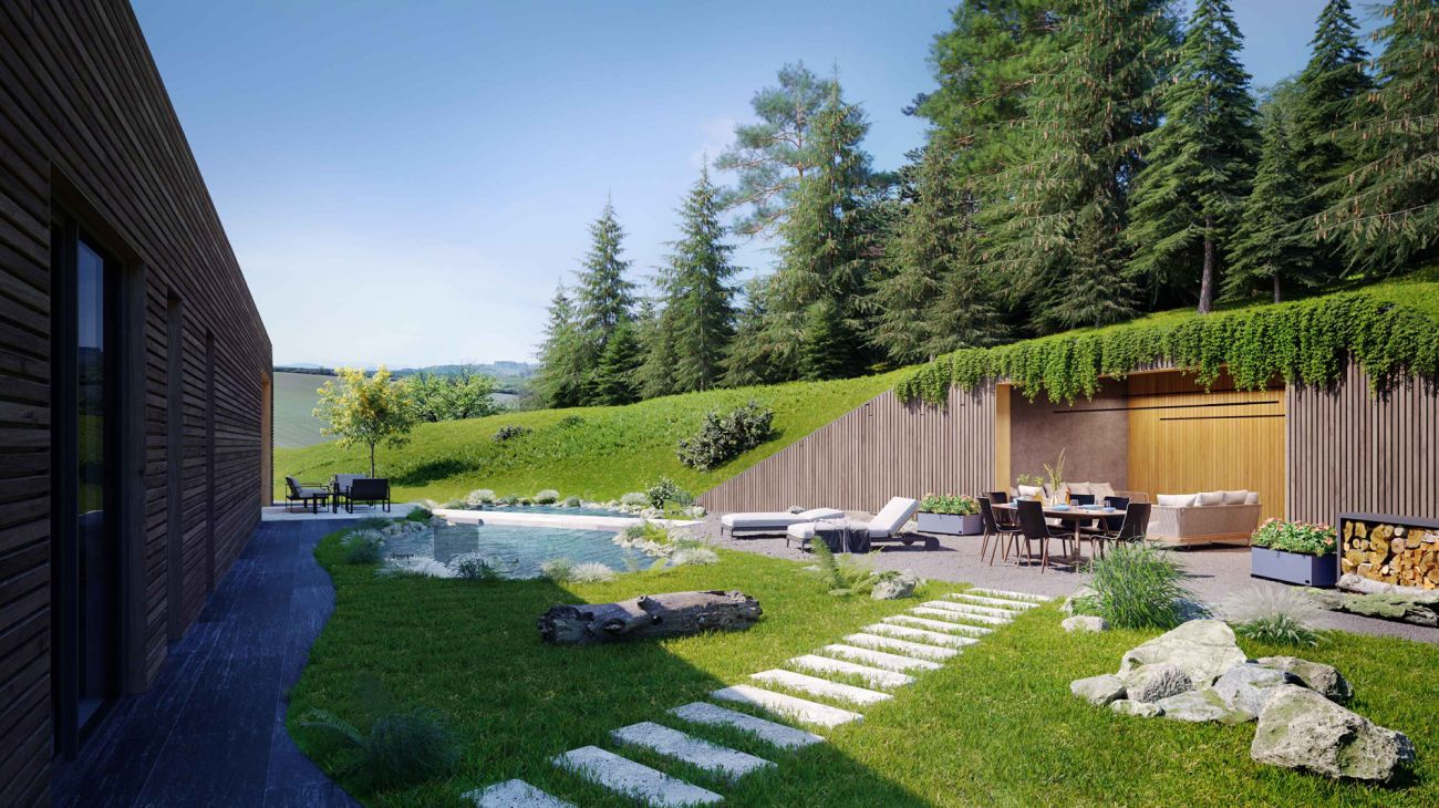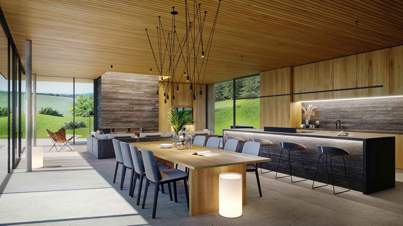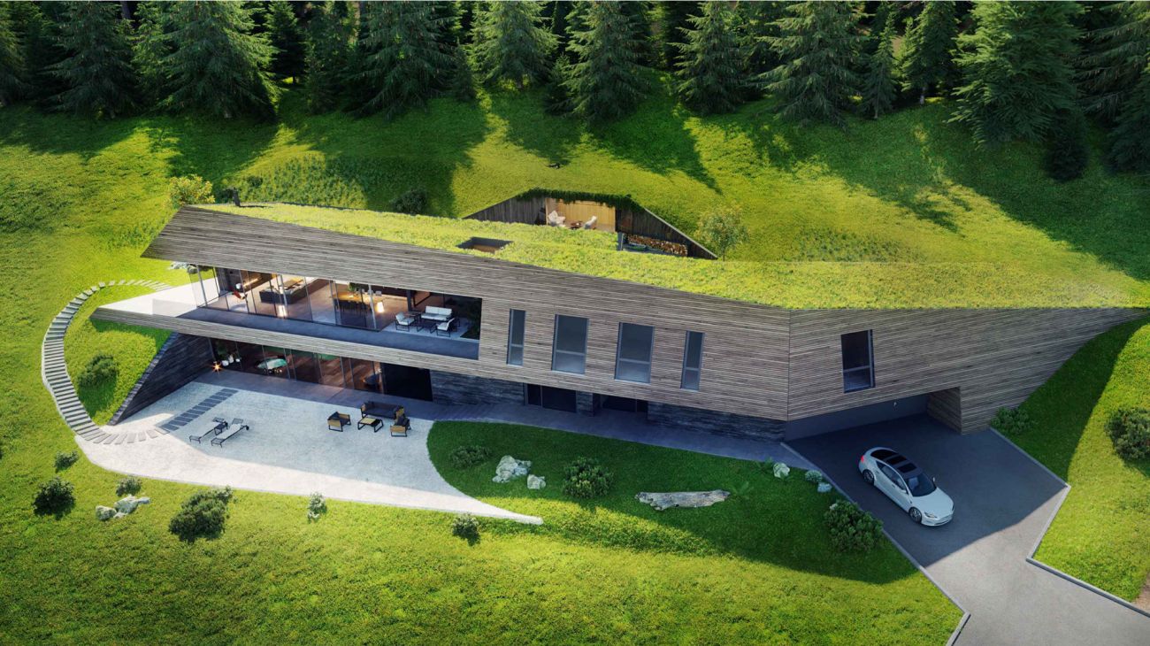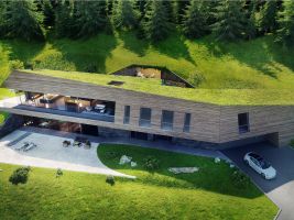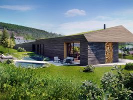 Propojení s přírodou zajišťuje i využitý přírodní materiál, zelená střecha a dynamicky tvarovaná fasáda. Díky té je poznat, že se jedná o ryze moderní stavbu, která ovšem naprosto přesně zapadá do okolní krajiny. To potvrzuje i přízemí zapuštěné do terénu, kde najdeme v budoucnu wellness centrum.