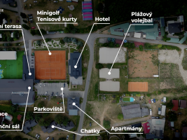 • Součástí areálu je velké sportovní zázemí: beachvolejbal, tenis, bowling, adventure golf